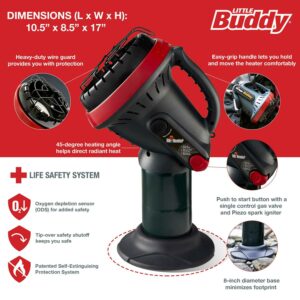 The comfort of North America s favorite portable heater packed in a smaller footprint. The Little Buddy gives 3,800 BTU to keep you warm in a tent, on the deck, or in an ice shanty. Screw the heater onto a 1-lb propane bottle for easy set-up. One push of the ignition button fires the burner to fight the breezy days and chilly nights. No bonfire needed with 95 square feet of radiant heat. All that coverage from a heater that measures just 8 inches at the base. With the heaters Life Safety System you won t sweat too much knowing the oxygen depletion sensor, thermal shut-down system, and tip-over switch are keeping you safe. It s like a space heater that doesn t need much space.