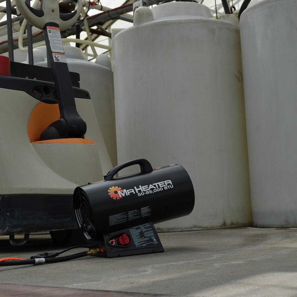 Heavy-duty design built for the job site. The Mr. Heater 50,000 – 85,000 Forced Air Propane Heater comes with a standard 10 ft hose and regulator and all the safety you would expect of a Mr. Heater product. Equipped with factory installed high limit switches and thermoelectric safety valves, you can feel comfortable using these heaters on any jobsite. Just plug the heater into a 110v outlet, hook up the included hose and regulator to a 20 lb propane tank or larger, and you are ready to take the chill out of any job.