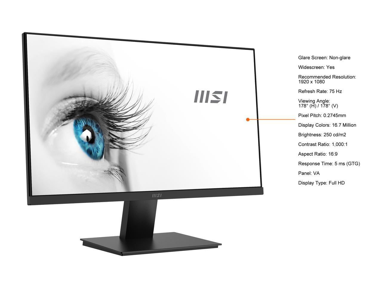 24″ Screen Size View your applications, spreadsheets and more with a perfect 23.8 inches screenFull HD Resolution Experience a breathtaking screen clarity that comes with Full HD (1920×1080) resolutionAnti-Flicker Technology With MSI Anti-Flicker technology, a stable output current for the monitor is provided to protect your eyesLess Blue Light Effectively reduce blue light which could cause serious long-term damage to your eyes75Hz High Refresh Rate The more images shown in the same time, the less burden will impose to your eyes Display Kit Support Providing the most convenient tool, the proper color & display mode to you while working with it everydayVESA Mount Support To be mounted on the wall of your office & home with a VESA standard design which can make it completely invisible on a deskMSI Pro MP241X 24″ Full HD LCD Monitor – 16:9