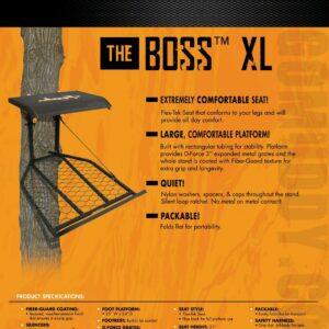 Bag the big game on your next hunting trip. Sit or stand far above your prey on this Muddy The Boss XL Hang-On 1-Person Tree Stand and stay out of sight and hearing of deer and other big game. This hang-on tree stand gives you more room than the standard The Boss tree stand. Scope out hunting spots and hunt big game from this 1-person, hang-on tree stand. To use, just attach this hang-on tree stand to any tree 9 to 20 inches in diameter. This 1-person tree stand supports up to 300 pounds of person and gear. Get all the space you need to move, position, and fire your bow or gun. This hang-on tree stand sticks to the necessities. You’ll get a comfortable, Flex-tek seat to sit on or to flip back for full platform use. Once the seat is flipped up, you’ll have the full 25-inch-wide by 34-inch-deep foot platform to maneuver. Carry this tree stand from hunting spot to hunting spot easily. It’s lightweight, hang-on design is super portable. The Boss hang-on tree stand only weighs 19 pounds and can be stored in a large bag or stashed in a cart.