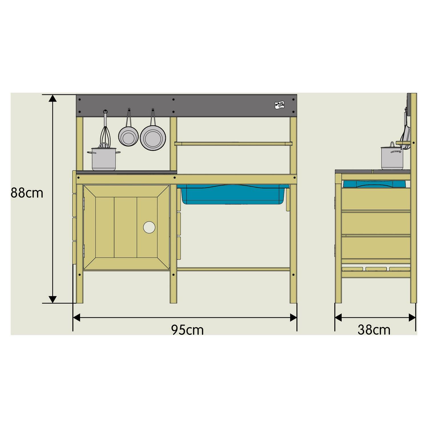 – INCLUDES: Wet and dry activity areas, hob and mud kitchen stencils, oven with door, removable splash tub, storage, hanging rail, chalkboard, serving station, stainless steel pots, pans, and whisk.