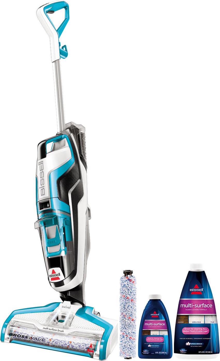 Vacuum and wash your floors at the same time! Get your hard floors cleaner than you could have ever imagined! The BISSELL Crosswave is a revolutionary all-in-one, multi-surface cleaning system that vacuums and washes floors at the same time. With a Dual-Action Brush Roll (2 included) rotating at 3,000 RPM and an innovative multi-surface cleaning solution (1 – 8oz. trial size and 1 – 32 oz. included), the CrossWave cleans better than a sponge mop and bucket, in less time*. Plus, with the touch of a button, you can seamlessly switch from cleaning hard floors to vacuuming and washing your area rugs. All with one machine.*Measured by BTP0257 hard floor soil cleaning test With the BISSELL CrossWave All-in-One Multi-Surface Wet Dry Vac you will get the shine you want with minimal effort.