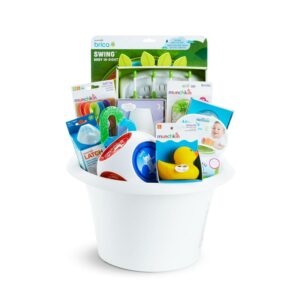– Large curated gift basket featuring 15 tried and true Munchkin products in our Sit & Soak infant tub
