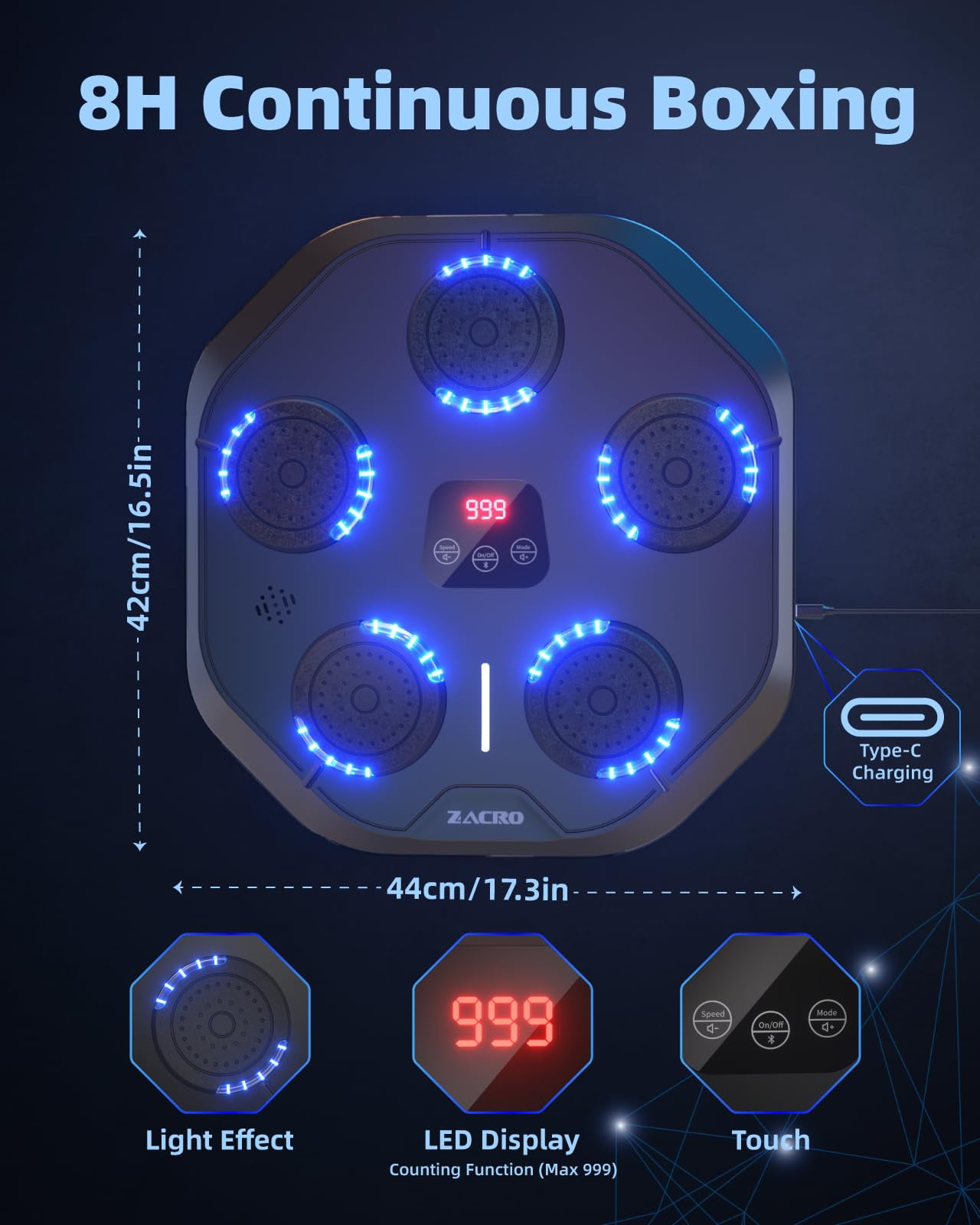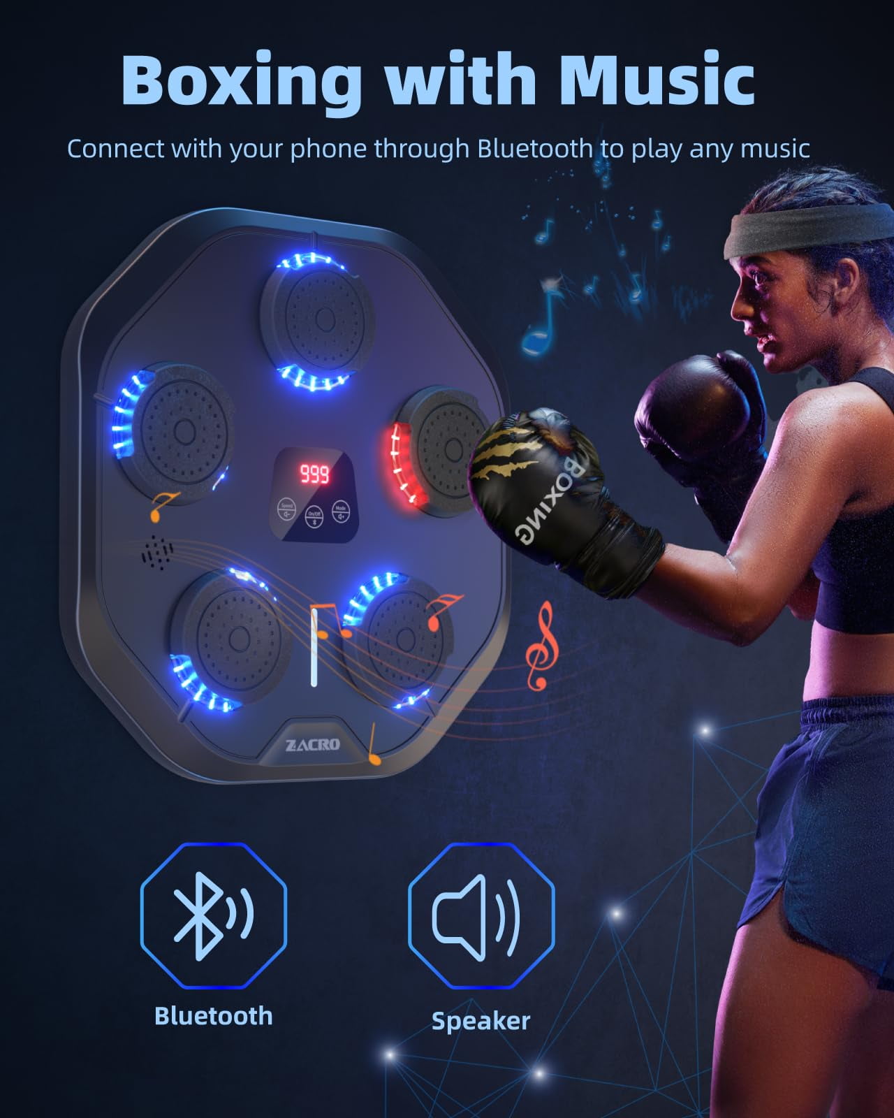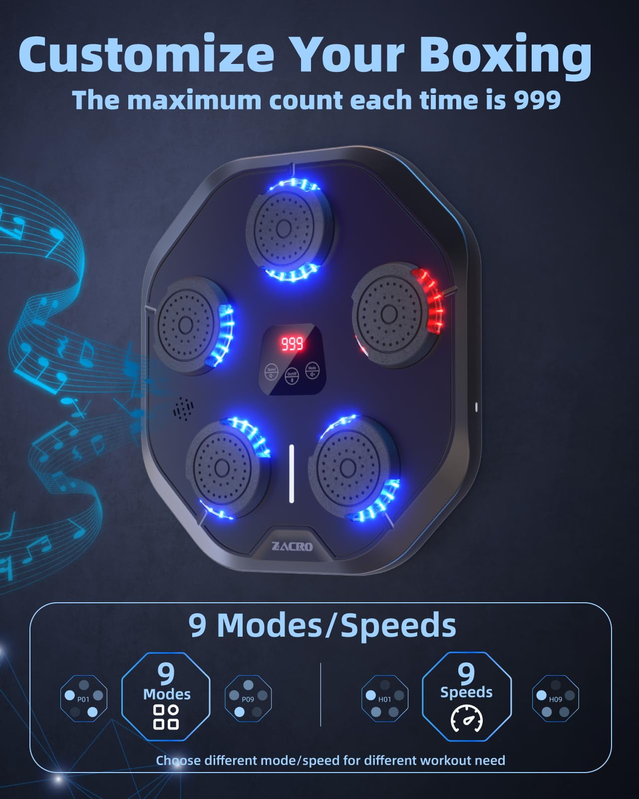 This Music Boxing Machineis the perfect professional training and daily workout tool for professional boxers, fitness professionals, dieters, kids, teens, office workers and more. With 9 training modes and speeds to suit all fitness levels, this musical boxing machine helps you create a professional workout in the comfort of your own home.Surround sound and dynamic lighting create an immersive training experience, and every boxing move is accompanied by a subtle and beautiful musical rhythm that releases stress and motivates you to box your way to fitness.