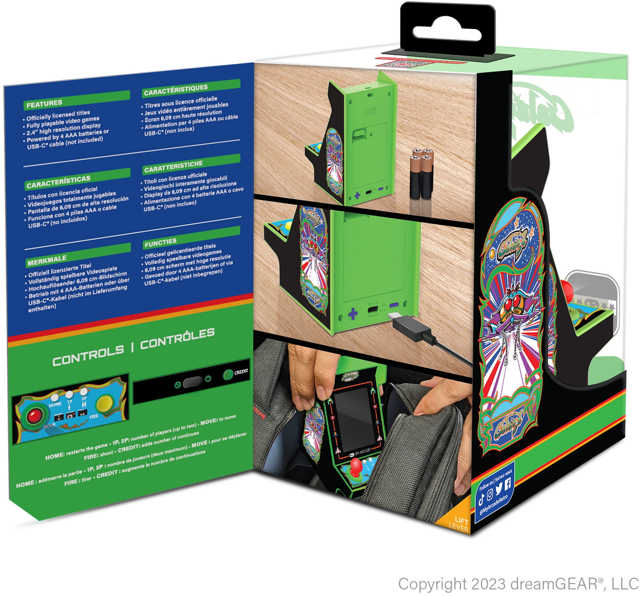 2 officially licensed titles 4.8-in. tall cabinet; features artwork inspired by the original Galaga® arcade cabinet High-resolution 2.4-in. full color display Intuitive user interface Built-in speaker with volume control Powered by either 4 AAA batteries (not included) or by a USB-C® cable (not included) Ideal for any game room, office, or display case; play at home or on the go Includes user manual Titles include Galaga®