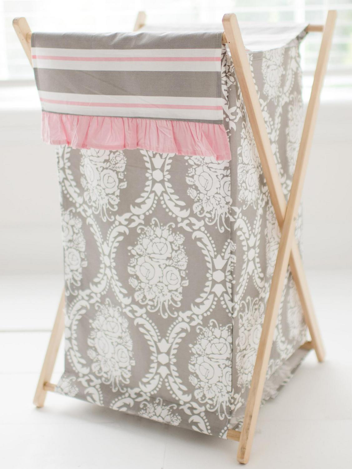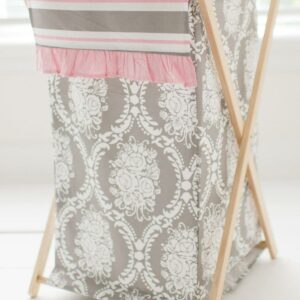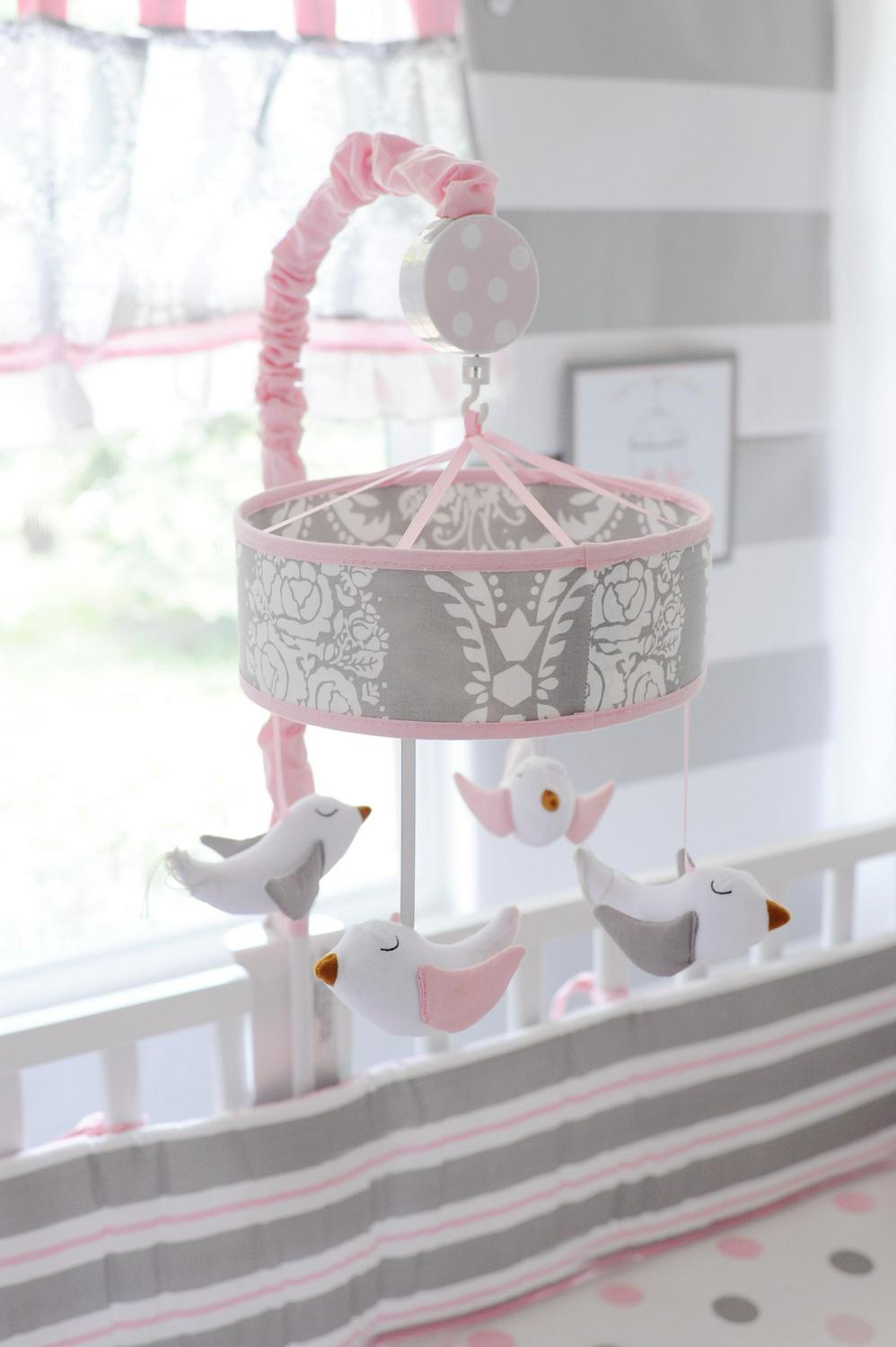 – 15 inch tailored crib skirt features a gray damask pattern with polka dot panels and soft pink bows