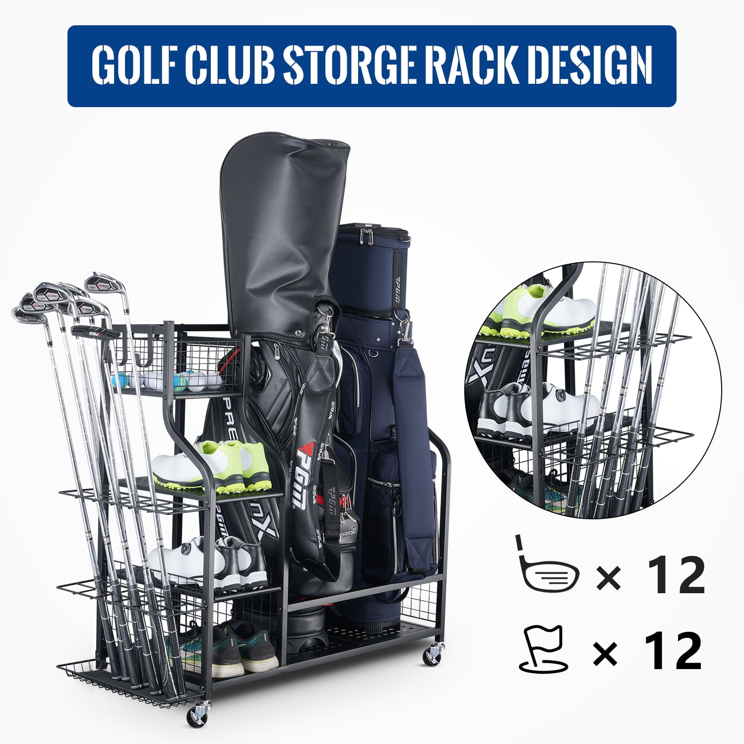 ⛳️【Extra Large Golf Storage Rack】This Mythinglogic golf storage organizer fit 2 standard golf bag or 1 large size. With 4 accessory shelves, 1 golf club storage stand and 4 removable hooks. Organize and store all your golfing equipment in one spot. ⛳️【Heavy-duty Adjustable Wheels】The golf bag rack be equipped with lockable wheels for mobility to adjust for uneven floors, so you can be sure golf organizer will stand straight in the garage, basement, shed, field, or whatever surface it’s on. ⛳️【Soft Edge Design Golf Rack】The golf organizer for garage is made of high-quality metal with powder coating that stops chipping, peeling & rust, this golf holder stand will last you for years to come. The golf bag stand is designed with soft edge to protect your golf bag from scratches. And the bottom of dual golf bag storage stand is hole steel board, which is more sturdy and durable than the net rack. ⛳️【Extra Golf Club Display Stand Rack】Compared with other golf storage organizers, this golf rack equipped with an extra golf club storage rack which can hold up to 12 golf clubs and golf flags. The golf storage space is extra large and ideal for golf lovers. ⛳️【Easy to Assemble】 The whole golf bag organizer dimensions is 40.4(L)x15.7(W)x34.3(H) . You also could store other sports equipment such as baseball bats, hockey sticks etc. The Detailed installation instructions will save your time and effort to assemble a golf bag organizer for garage.