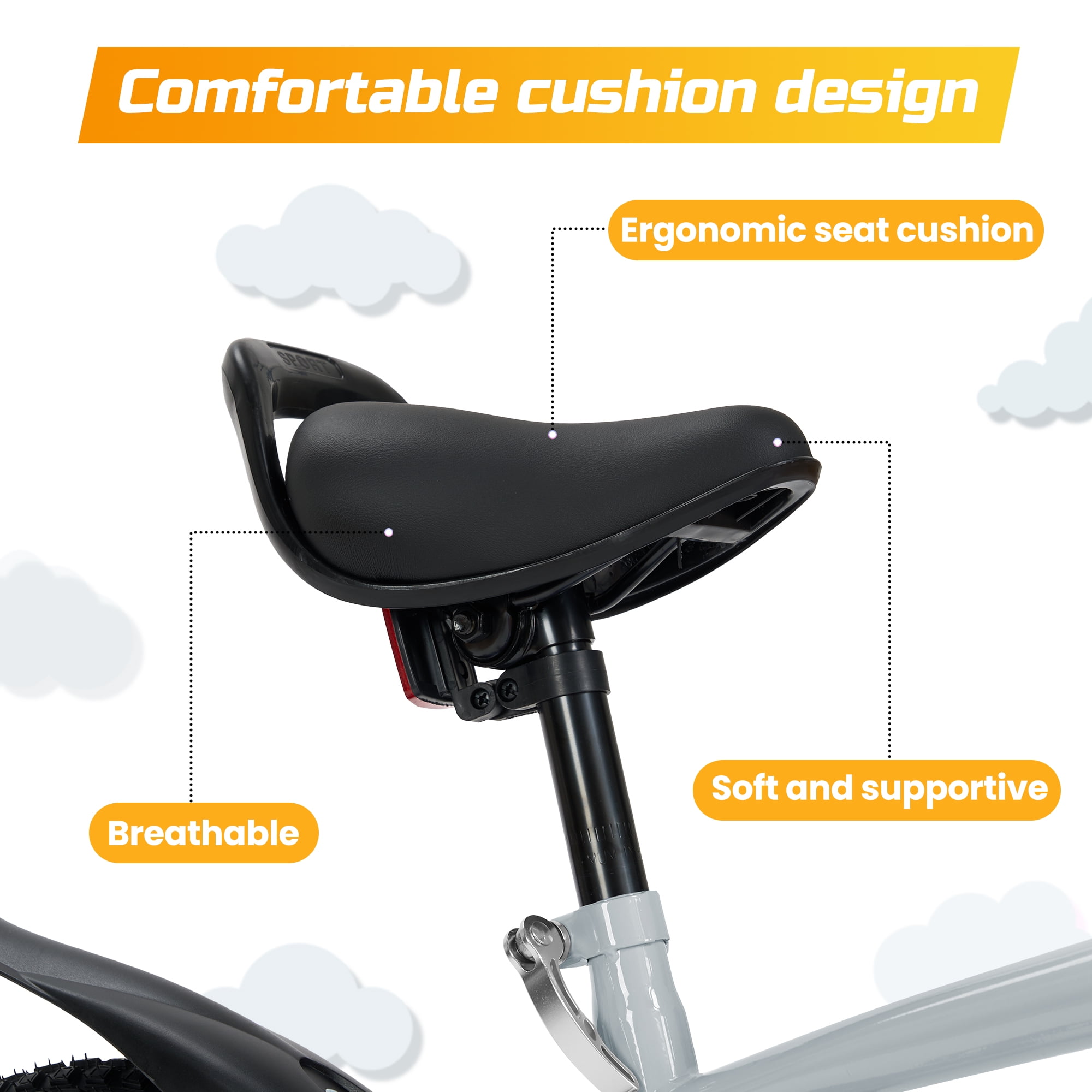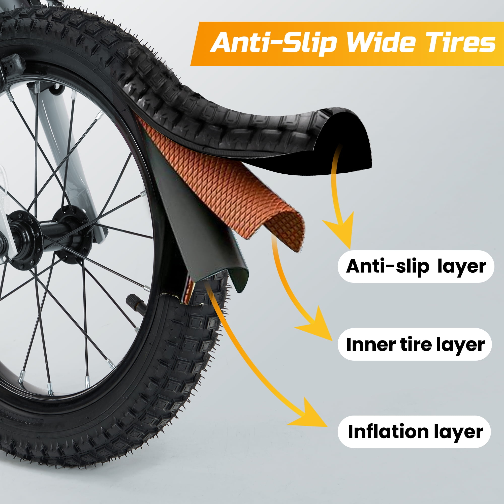 This bike undoubtedly serves as a source of summer fun for children. Riding with friends on hot summer days allows them to enjoy the cool breeze and feel the warmth of friendship. Size Recommendation:The 14-inch bike is suitable for children aged 3-6, recommended for heights between 37”-42”. The adjustable seat, with a height range of 19”-25” from seat to ground, features cleverly designed handlebars behind the seat. This design not only provides convenience for parents during teaching but also enhances children’s sense of safety while riding. Grew Up With Kids:The adjustable training wheels help maintain the bike’s balance effectively, while the flexibility of adjustments enhances the fun for children during their riding experience. Performance and Safety:From the kid bicycle brake system to the tires, every detail has been carefully selected and designed to ensure outstanding performance and safety during the riding experience. Outdoor Options:The bike weighs 18.3lbs overall, and the handle behind the seat can be easily moved, making it suitable for families to take outdoors and play with their children. Whether it’s a weekend parent-child ride or a family outing during the holidays, this bike is an excellent choice for you and your child to spend quality time together. Upgrade Brake System:The dual brake system undoubtedly provides higher safety assurance for children’s riding. The front brake, designed specifically for beginner riders, is complemented by a foot brake, offering a more flexible braking method.