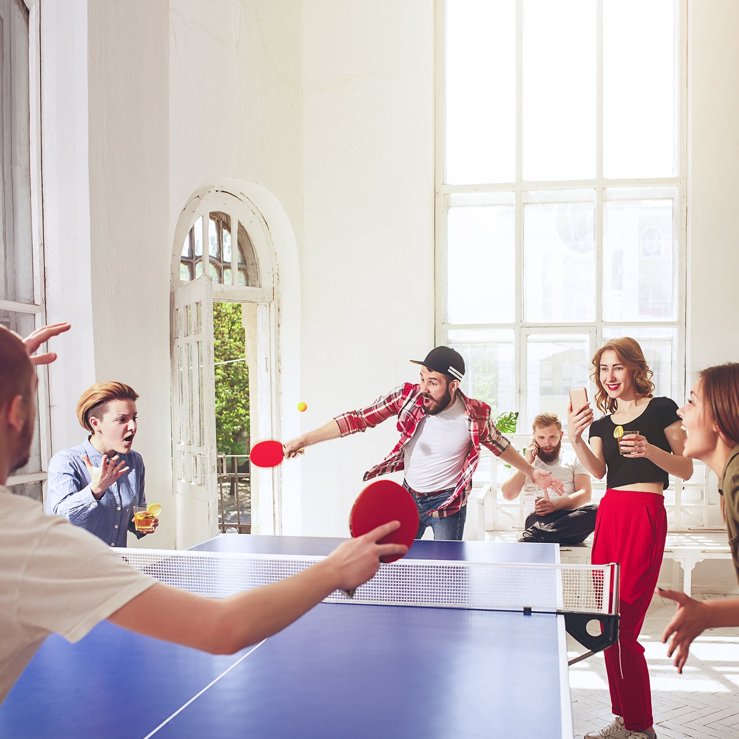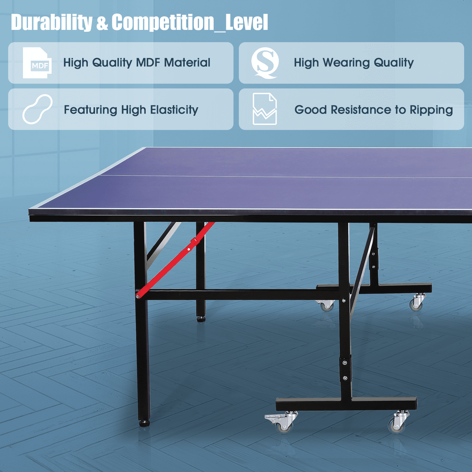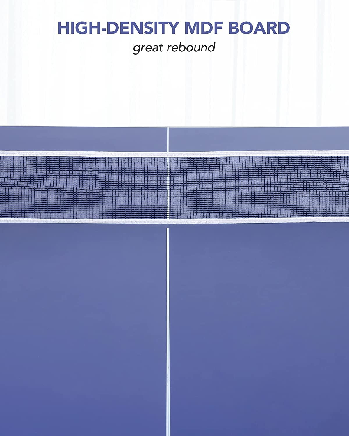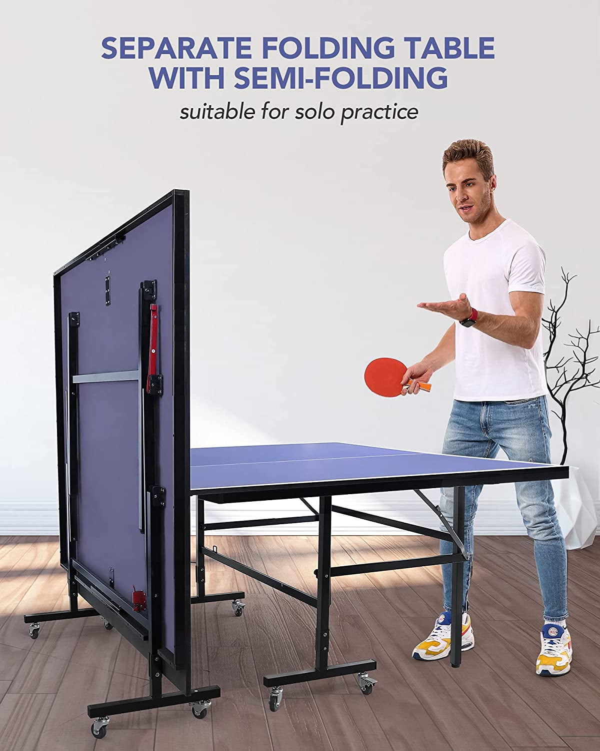 10 MINUTE ASSEMBLY: The table tennis table is made of high-quality high-density fiberboard. The surface of the ping-pong ball is composed of 4 high-quality MDF boards, which makes it easier to carry and move to various places to assemble. Quick assembly – Just attach the wheels and the ping pong net. Assembled product weight:119lb Safety Table Tennis Table: Our ping pong table comes with 4 lockable casters to ensure a secure ping pong table locking and prevent accidents during playing or storing. The thickened extra-large casters are sturdy and durable, no frictions or damages to floor, Keeps you safe all the time while you enjoy your ping pong game. 5/8 Inches MDF High-quality & Durable: Our ping pong table is made of high-density MDF to meet tournament standards and high-end industrial standard with good rebounding for ping pong, The quality of the panel determines the height of rebound, plays as given sized indoor ping pong table suitable for home, office, or entertainment center. Silver thickened circular tube features rust-resistant and sturdy with good appearance. Technical high-density nylon net is thicker and stable. Adjustable Height: The height of ping pong table legs are adjustable. Customized design to choose suitable height, available for both adults and kids. The adjustable table tennis table can be used on different ground, not limited to flat area only. The thickened steel legs sized 1.2 inches with fastened support braces provide a more stable and sturdy weight capacity. Space-Saving and Foldable: 108(L)*60(w)*30(H) inches table meets all your recreational needs. Our table tennis table can be folded in 90°, sized 54(L)*60(W)*3.7(H) inches after folding. Taking small space and suiting various house type to save. The bottom has eight castors easy to move and pull. Moreover, after folding single player playback mode can be applied on table tennis table as well, Let you improve your table tennis skills even when you are alone.