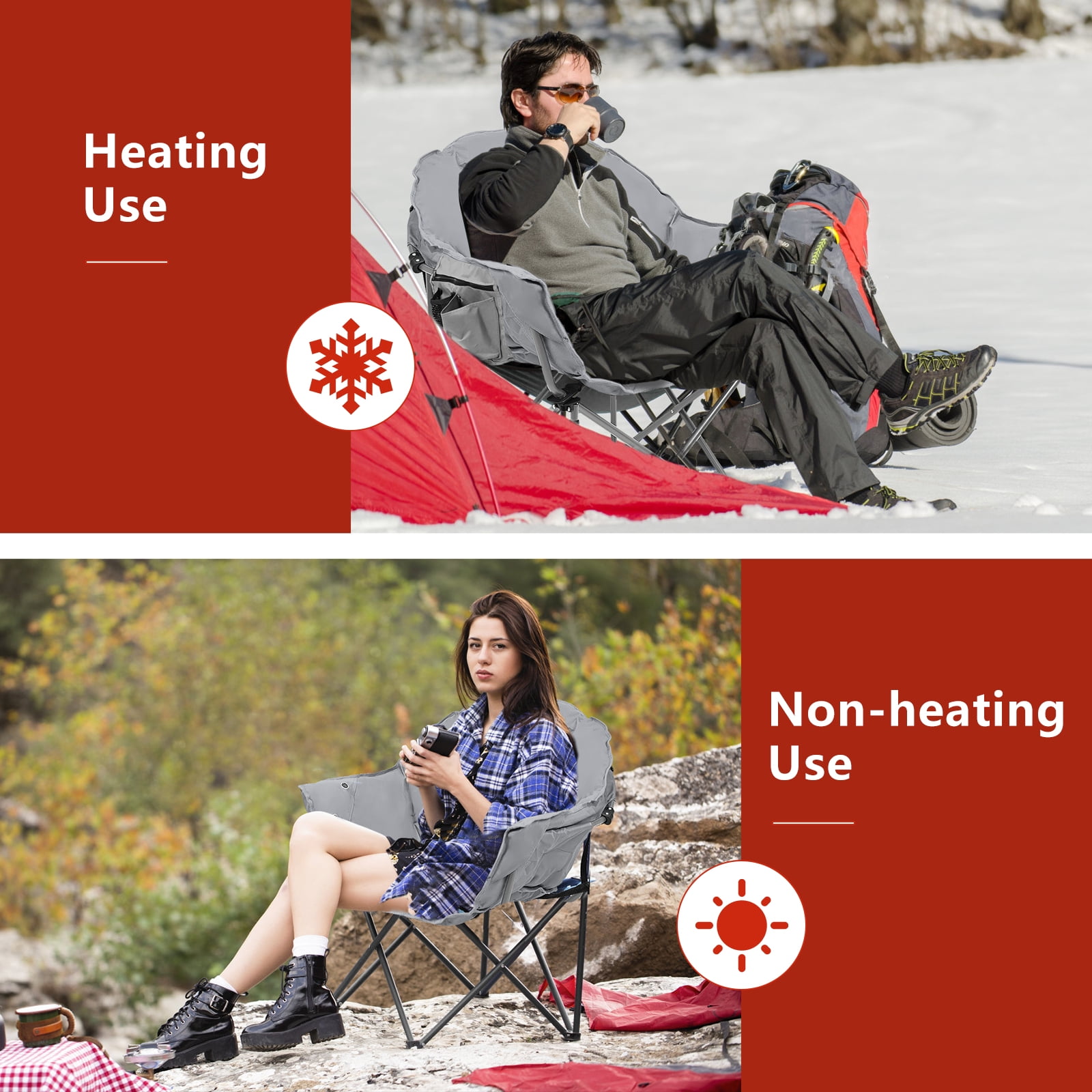 【Quality Material Selection】The Heated Camping Chair are made of high quality materials, durable and sturdy steel frame structure to ensure safety and quality. The heated camping lounge chair can withstand up to 500 pounds. The fabric is soft and comfortable and tear-resistant. 【HEATED CAMPING CHAIR】The Heated Camping Chair three when the temperature is adjustable, high, medium and low. Can be heated with any USB battery pack (batteries not included), providing you with ultimate warmth and comfort even in the cold winter. Suitable for camping, fishing, sporting events, lawn, garden, patio, backyard, outdoor activities and more. 【Dual Control Buttons】 The Heated Camping Chair has two control buttons. The lower button controls the seat heating and the upper button controls the back heating, turn on both buttons to heat at the same time. You can choose to heat the backrest or the seat, or both at the same time. 【Aesthetically Pleasing and Comfortable】The Heated Camping Chair is moon shaped and ergonomically designed with an extra large seat and backrest area. The full padding provides extra comfort and support. You can sit comfortably with your legs crossed or on your side, relax and enjoy your trip. 【Convenient and Easy to Carry】The Heated Camping Chair is easy to fold, no assembly required, lightweight and easy to carry. There are battery pack pockets and storage pockets for USB batteries, beverages and cell phones. Comes with a carry bag for easy carrying and storage.