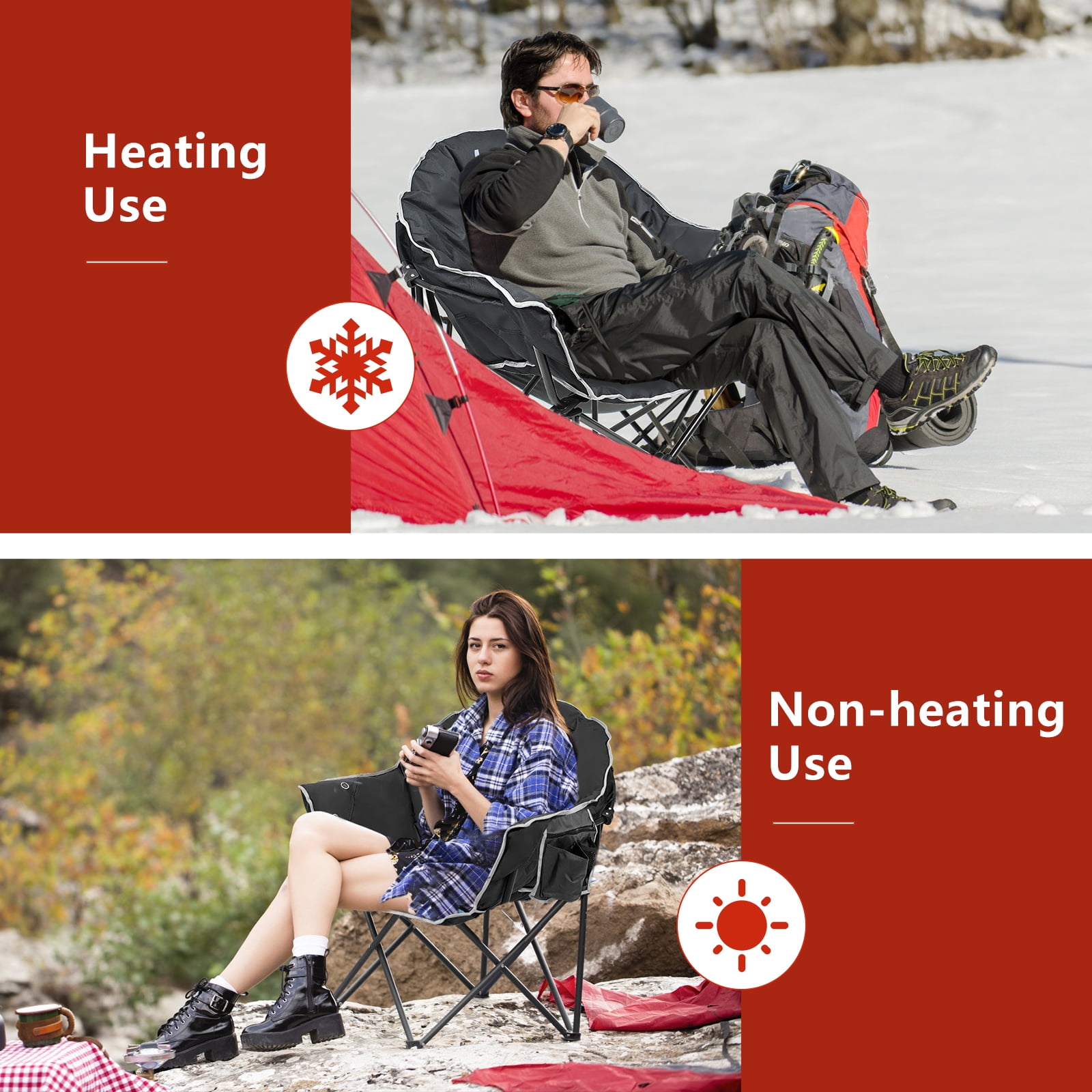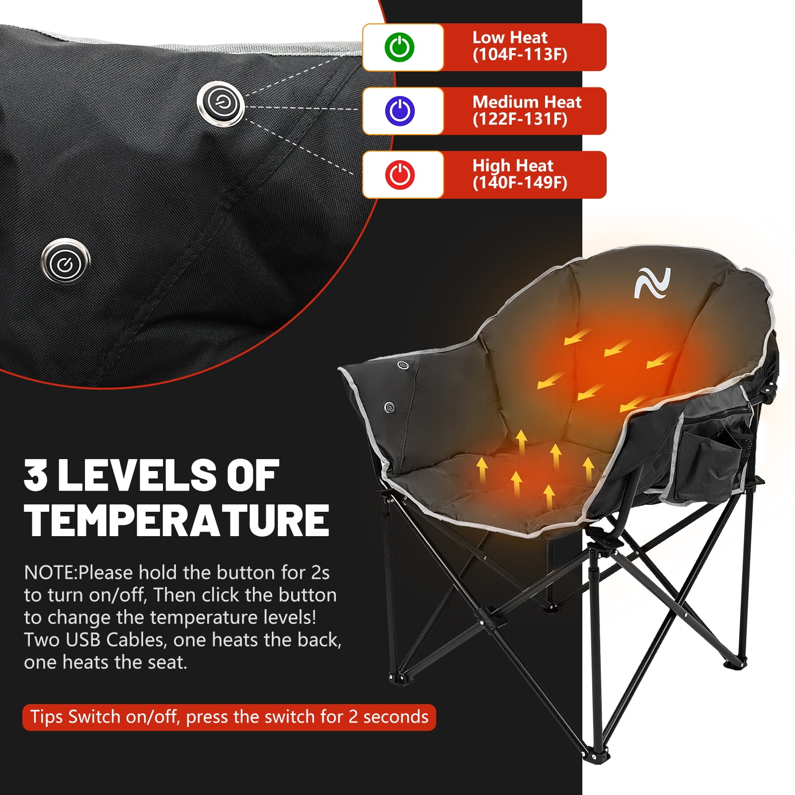 NAIZEA Oversized heated camping chair features USB powered heating technology (batteries not included). Large seat and backrest area is soft and comfortable, providing ultimate warmth for your body in cold weather. Keeps you warm and cozy during any outdoor sports, beach, lawn, picnic activities. This folding camping chair has two controls to heat the backrest and seat. High, medium, and low when the temperature is adjustable, and it can be heated with any USB battery pack (batteries not included), for up to several hours. The heated camp chair is foldable and compact with side storage pockets and comes with a carry bag for easy transportation to wherever your adventures take you. Oversized moon-shaped design allows you to relax and enjoy the ride, ideal for camping, fishing, sporting events, lawns, gardens, patios, outdoor activities and more.