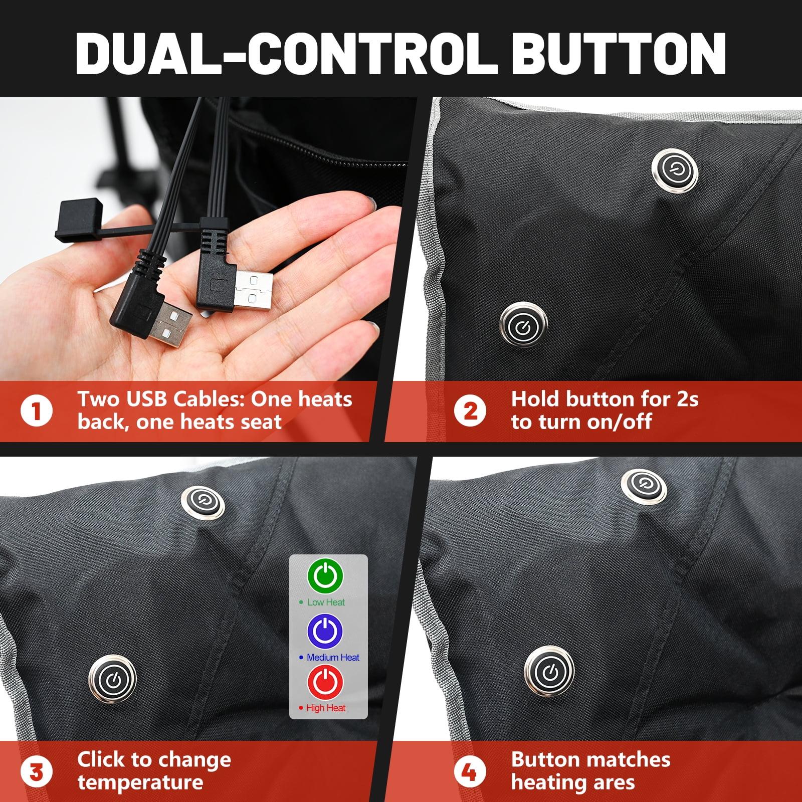 【Quality Material Selection】The heavy-duty camping chair are made of high quality materials, durable and sturdy steel frame structure to ensure safety and quality. The heated camping lounge chair can withstand up to 500 pounds. The fabric is soft and comfortable and tear-resistant. 【3 Levels of Temperature】The Heated Camping Chair three when the temperature is adjustable, high, medium and low. Can be heated with any USB battery pack (batteries not included), providing you with ultimate warmth and comfort even in the cold winter. Suitable for camping, fishing, sporting events, lawn, garden, patio, backyard, outdoor activities and more. 【Dual Control Buttons】Our patio lounge chair has two control buttons. The lower button controls the seat heating and the upper button controls the back heating, turn on both buttons to heat at the same time. You can choose to heat the backrest or the seat, or both at the same time. 【Aesthetically Pleasing and Comfortable】This folding Camping Chair is moon shaped and ergonomically designed with an extra large seat and backrest area. The full padding provides extra comfort and support. You can sit comfortably with your legs crossed or on your side, relax and enjoy your trip. 【Convenient and Easy to Carry】NAIZEA heated camping chair is easy to fold, no assembly required, lightweight and easy to carry. There are battery pack pockets and storage pockets for USB batteries, beverages and cell phones. Comes with a carry bag for easy carrying and storage.