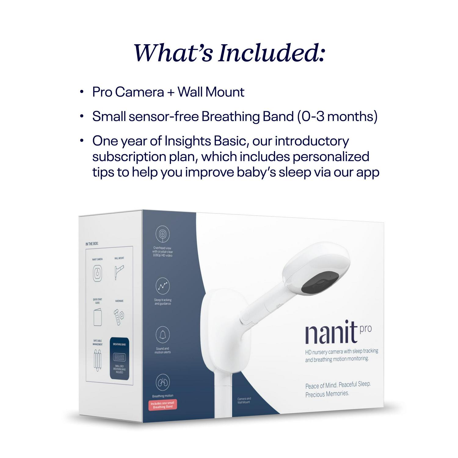 – Includes: Nanit Pro Camera with Wall Mount, 1 small Breathing Band and 1 year of Nanit Insights, personalized sleep tracking analytics available only with Nanit Wall Mount or Floor Stand