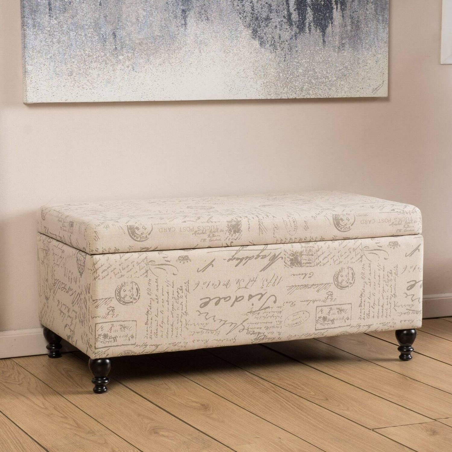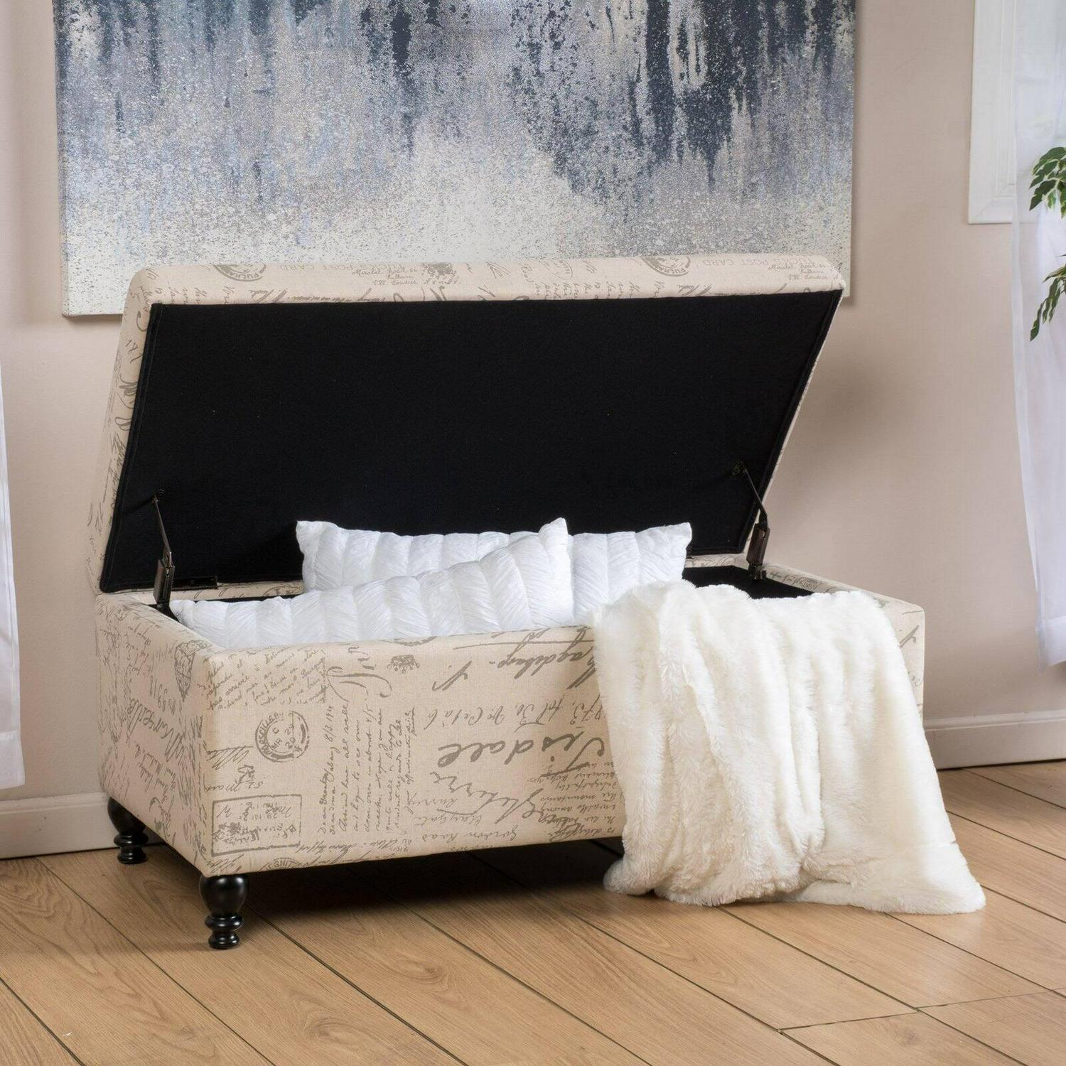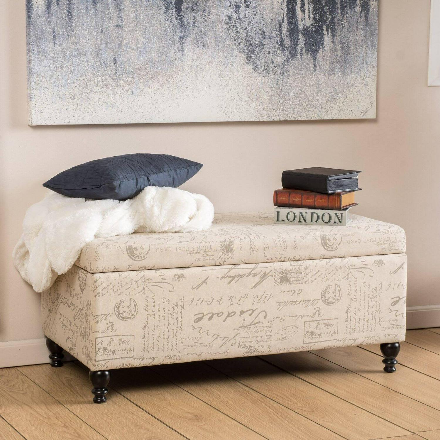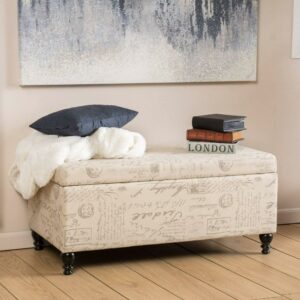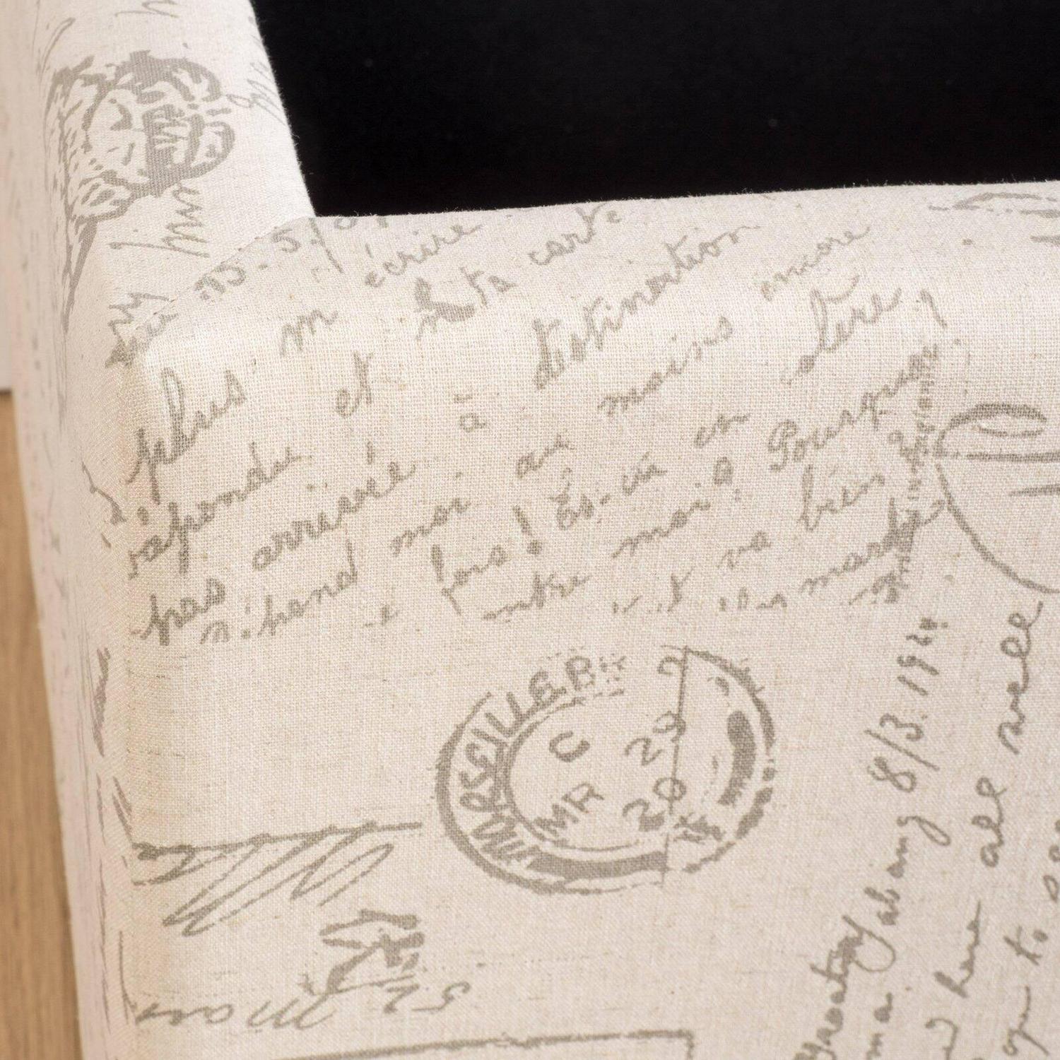 The Nannie Storage Ottoman lends your home some French-chic flair thanks to its adorable fabric upholstery with an allover scripted text and vintage postcard design. This softly colored, cushioned ottoman features a hinged lid that easily opens up, revealing a roomy inside area to stash linens, pillows, books, and more.