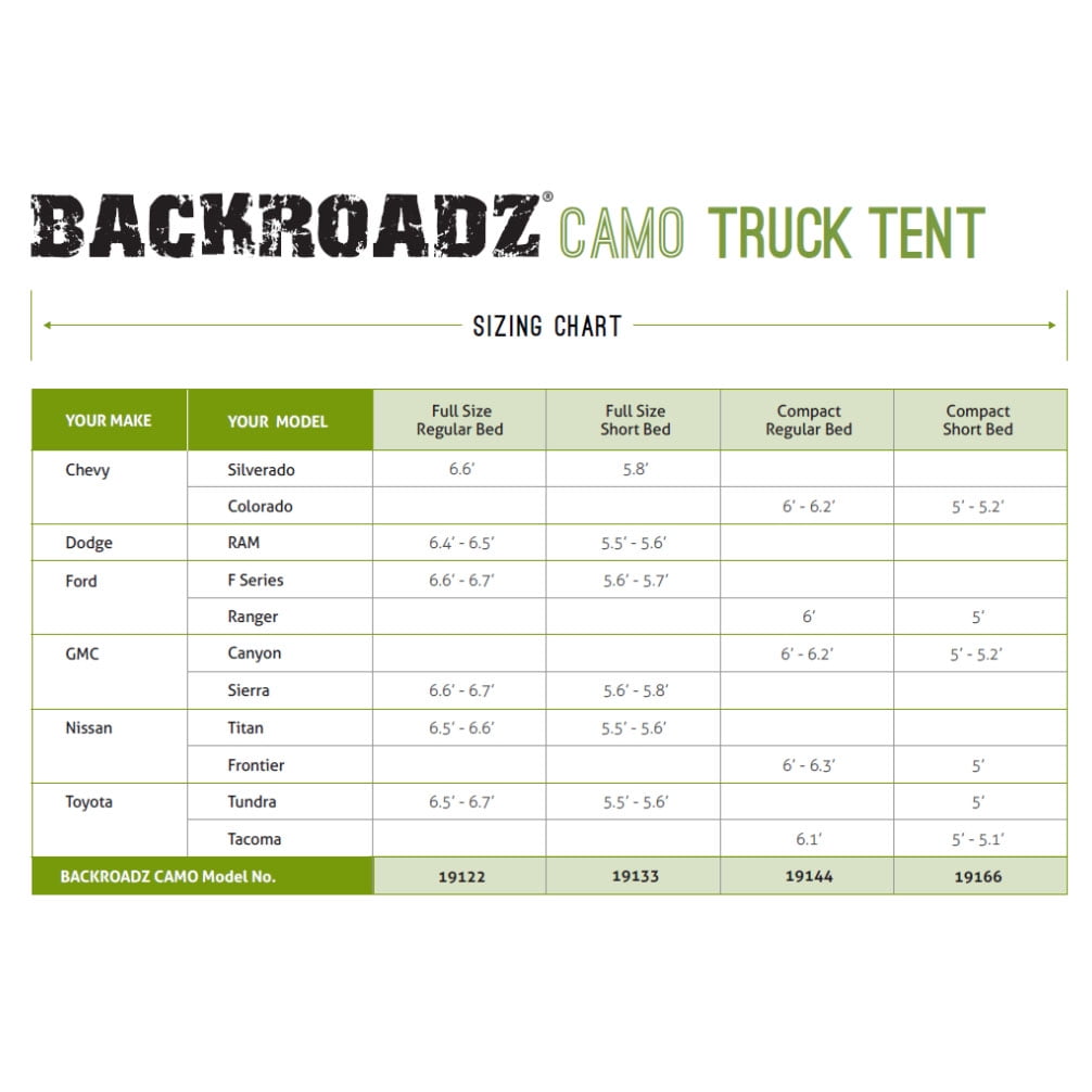 Camp out wherever your pickup can take you with this compact/short truck bed outdoor tent Spacious interior offers ample room for up to 2 adults to comfortably relax; Max center height is 62 inches tall Internal gear loft, gear pocket, and lantern holder keeps your personal items neatly organized Features full rainfly and storm flaps for increased privacy and protection from all the elements Works with specific vehicle types with a compact or short truck bed measuring 5 to 5.2 feet long Large entrance door and 2 mesh windows offer optimal ventilation inside the tent Easy 10-minute set-up with color-coded poles and sleeve assembly; Includes convenient carry bag Provides added safety and security camping inside bed of your truck Ideal for use in nearly any season including spring, summer, and fall Compatible with various Chevy, Dodge, Ford, GMC, Nissan, and Toyota makes and models; Full list available in images Sleeps: 2 people Windows: 2 Doors: 1 Center height: 58 to 62 inches Frame: Fiberglass poles Tent material: 68D polyester taffeta Floor material: Polyethylene Color: Camouflage Weight: 16 pounds