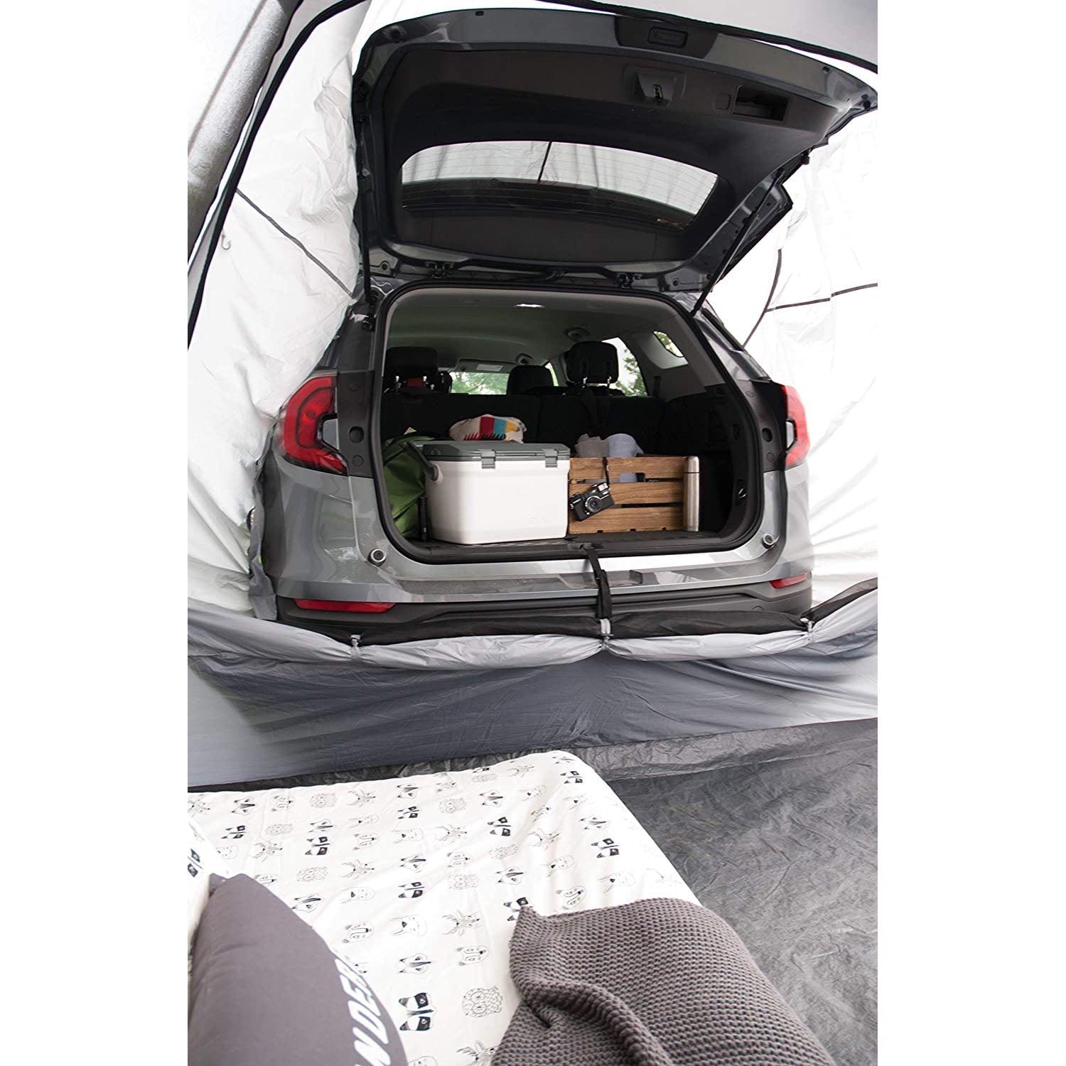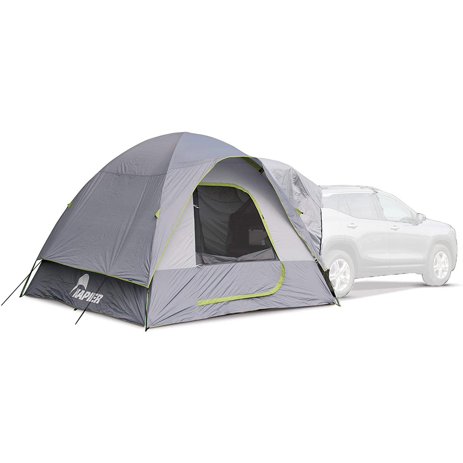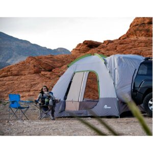 Sleeping in your car shouldn t feel like it. Say goodbye to cramped spaces and elevate your camping game with a Napier Backroadz SUV Tent. Stay connected to the things you need at night, or extend your living space to fit the whole family. This car camping essential is designed to seamlessly connect the tent to the cargo area of your CUV, SUV, and minivan in under 15 minutes. The perfect camping accessory for those who want to spend more time enjoying their trip and less time setting up camp. This car camping tent is a versatile camping accessory that can quickly transform your car into a cozy tent for 5, perfect for those who want to enjoy the great outdoors without sacrificing comfort. The vehicle sleeve allows for a spacious 10 x 10 ground tent and over 7 of headroom with a seamless connection to the cargo area of your vehicle. Organizing your camping gear has never been easier, thanks to the gear loft, gear pocket, and lantern holder. The tent has one large door and three mesh windows for breathtaking views and ventilation. So, whether you’re heading to the beach, a music festival, or just spending a weekend camping in the great outdoors, the Backroadz SUV Tent has you covered.