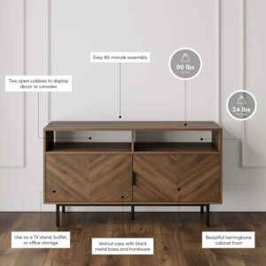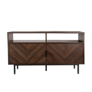 Izsak is a sophisticated and functional media console cabinet that demands attention with its 2 dark wood doors decorated in a sleek, elegant, herringbone design. This statement piece has modern matte black metal legs with footpads attached to keep your floors from being scratched. With multiple storage options, this TV stand or entertainment center is perfect to tuck away electronics thanks to its open holes in the back. Elevate your hosting game by using Izsak in your dining room to display your charcuterie board skills. This walnut buffet cabinet offers plenty of hidden storage and enough space to keep your home clutter-free, plus, you can adjust the shelves in the storage cabinet for the perfect amount of space and use the cubbies to tuck away electronics, books, or extra tableware.