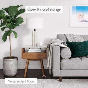 – This modern end table with storage for the living room is compact for small spaces and can even be used as a nightstand or accent table.