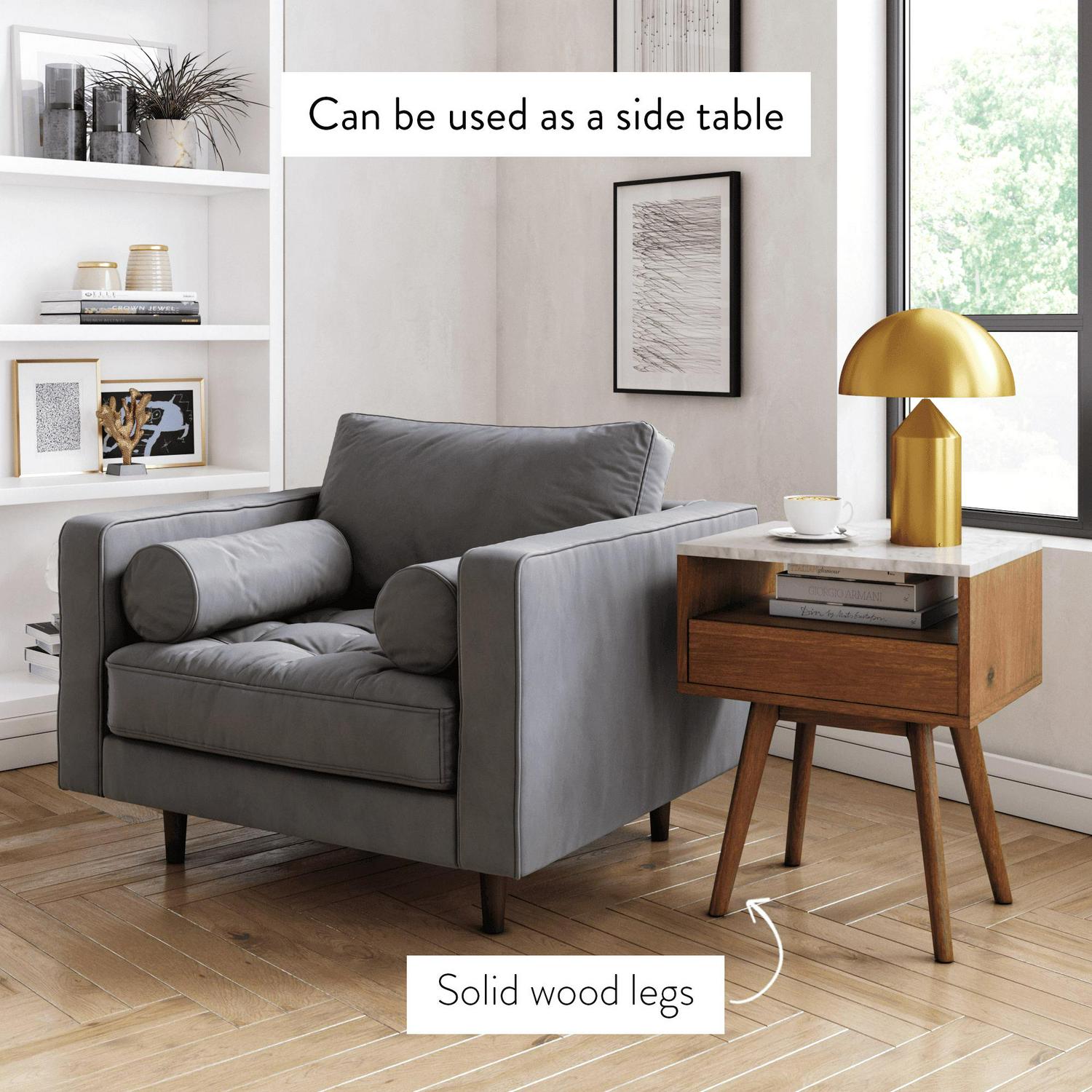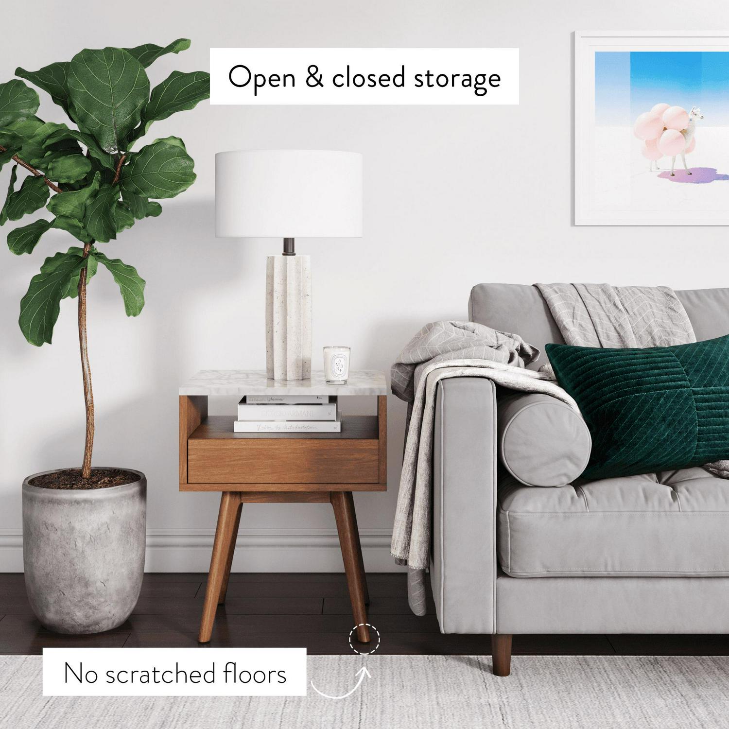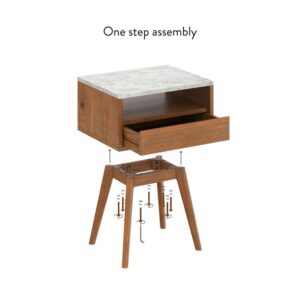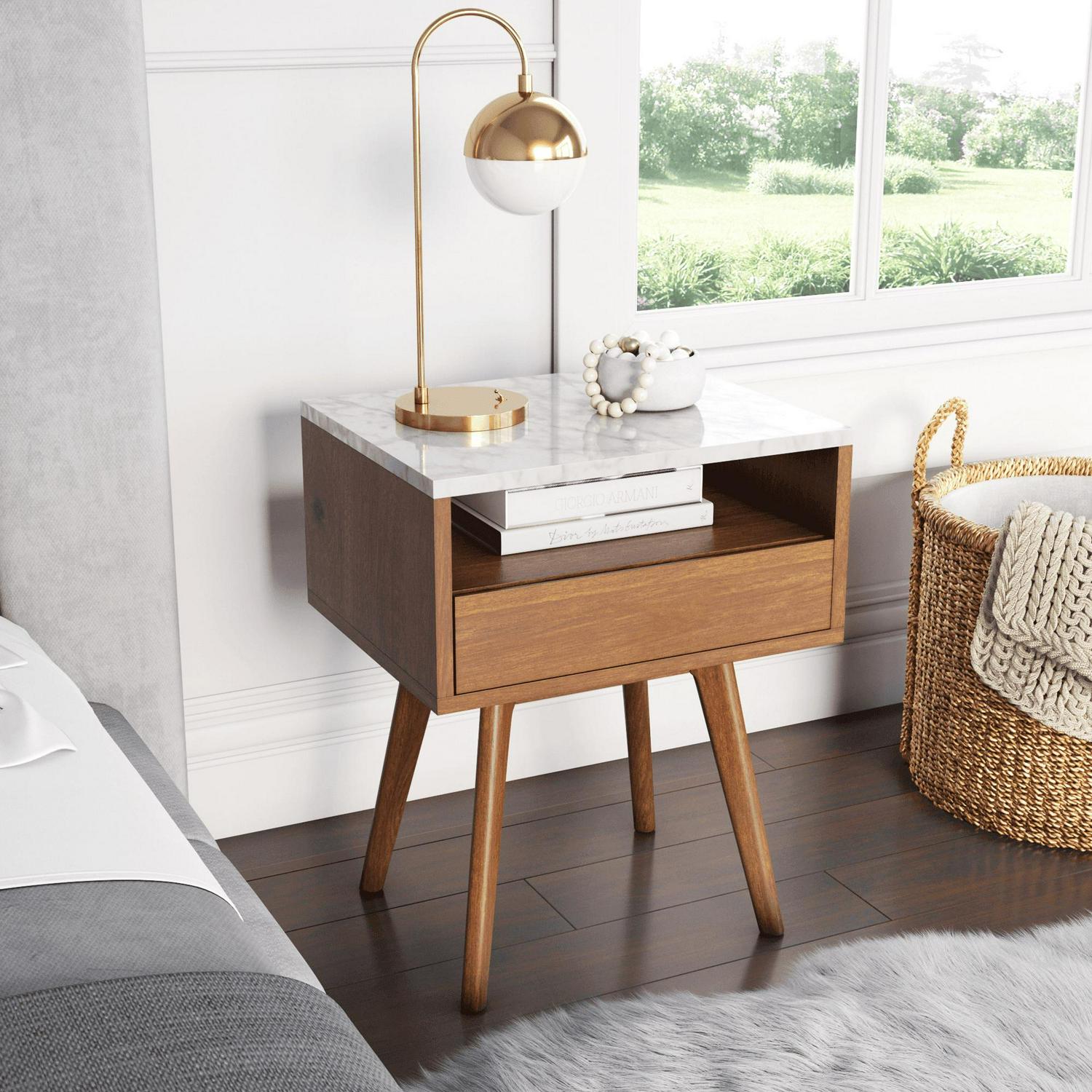 – James is a unique mid-century side or end table with its floating faux white marble tabletop, complimented with a walnut veneer finish and an optional drawer for extra storage.