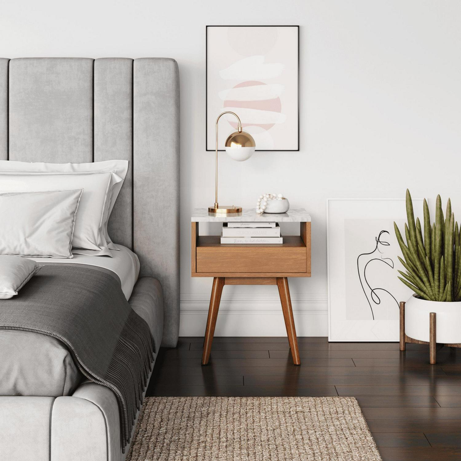 The James side table evokes a timeless mid-century design with slim tapered legs. The best feature having the option of closed and open storage. With beautiful mixed materials of solid wood veneer with walnut finish and a marble table top. James is a versatile design that can be used as a side, end or nightstand, it’s the perfect addition for any room. Display books that make you look smarter in the open storage compartment and top of the marble top with a beautiful brass lamp and a fresh succulent. This product does require assembly, but good news is… it only takes 5 minutes.