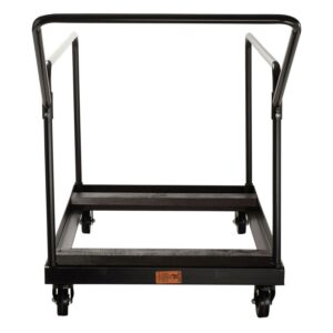 National Public Seating Vertical storage folding table dolly has storage capacity of 1200 lbs and is suitable for use with 60″ round plastic or laminate folding tables.