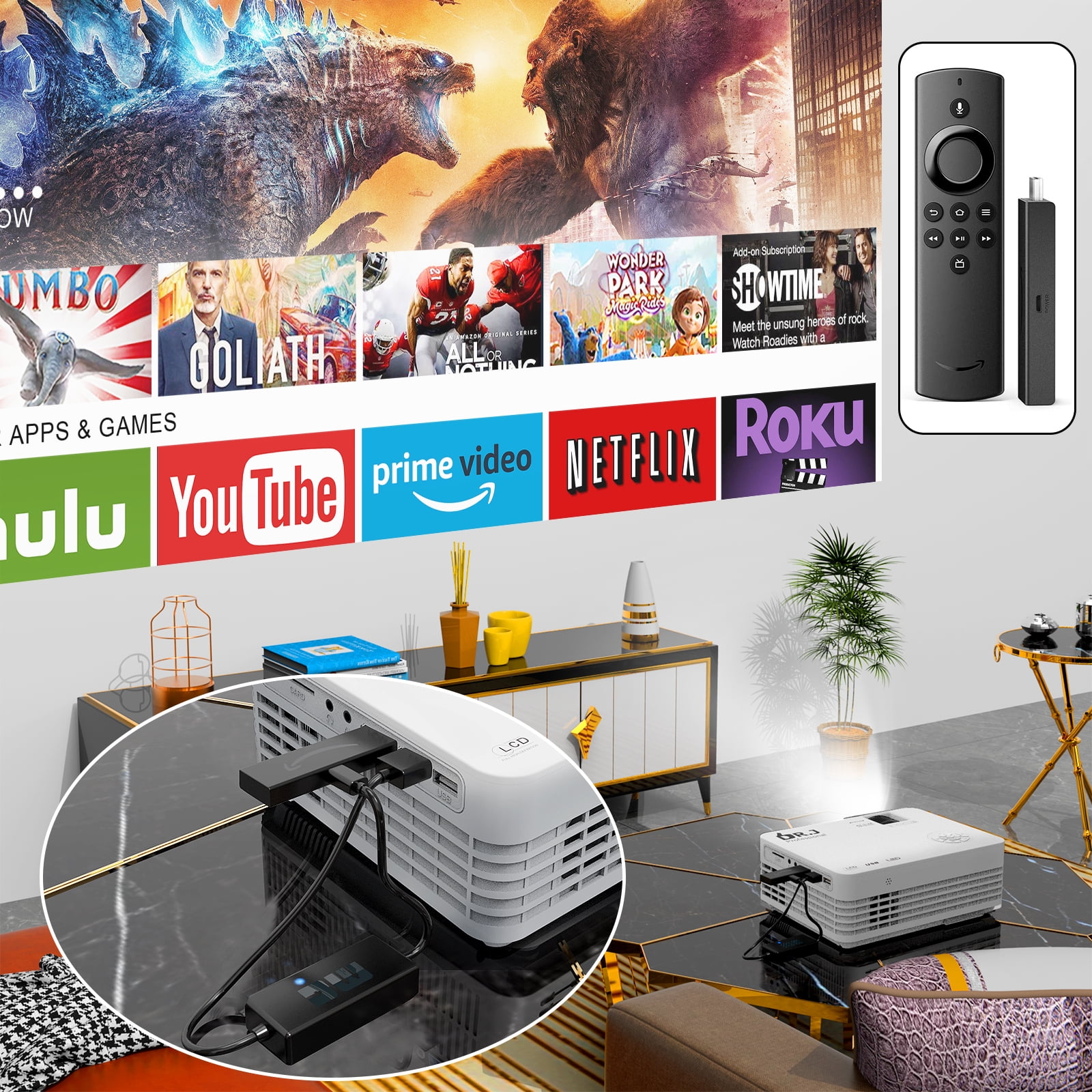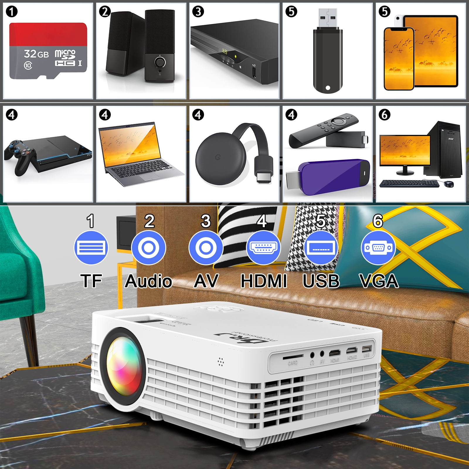 ✔ Native 1920x1080P, Full HD 4K 300 inch Display supported ✔ Bluetooth 5.1 technology ✔ 5G Wifi wireless connection ✔ 10000:1 Contrast Ratio, 4:3/16:9 Aspect Ratio ✔ with keystone and focus ✔ Palm-size and lightweight, it is so portable that you can take it anywhere ✔ Equipped with 2 x built-in stereo surround speaker, allows high pitch, accurate mediant and powerful low pitch, giving an excellent sound quality ✔ Updated fans keep noise lower, making sure you won’t be annoyed when watching ✔ HDMI, VGA, USB, Micro SD and AV input ✔ 120″ Portable Projector Screen Included