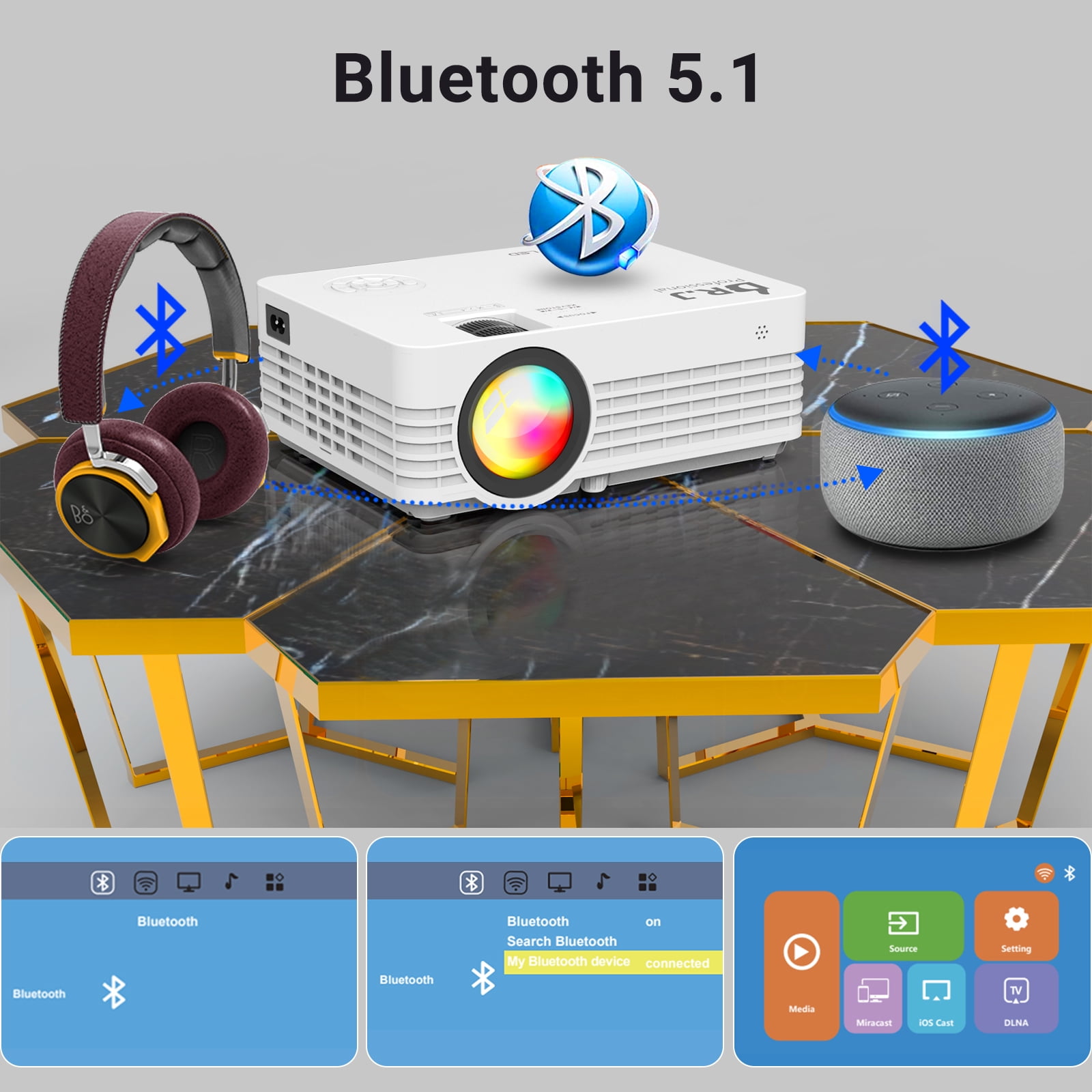 NATIVE 1920*1080P Resolution: Up to 300″ screen with fantastic image clarity, outstanding color accuracy and incredibly sharp detailed images without downscaling or compression. Combining an innovative high-refraction 6 layers glassed lens, ensuring the best video experience. 2022 Latest 2.4G/5G WiFi Function + USB Cable connection directly: Adopting the latest WiFi smart phone synchronize screen technology can easily connect your iOS/Android device simply. Also supports synchronizing smartphone screens via USB cable directly, both for android and ios systems, without any extra HDMI adapter or APP. Bluetooth 5.1 Function & Built-in Hi-Fi Speaker: Use the Bluetooth 5.1 function of the wifi Bluetooth projector to connect your Bluetooth headphones, Bluetooth speakers, soundbar, and other audio devices to enjoy the sound in freedom. Come with 120 inch projector screen:It is packed with a 120″ portable projector screen for your daily home theater use and outdoor movie. Outstanding Sound System: Update the built-in stereo surround speaker, justenjoy the pleasure sounds in different scenes, such as enjoy the movie projector indoor or outdoor. Add bluetooth function. Connect your Bluetooth headphones, Bluetooth speakers, soundbar, and other audio devices to enjoy the sound in freedom. Upgraded cooling system. Adopt Turbo Heat Dissipation to Reduce Noiseand dissipate heat better, reduce the occurrence of black spots, and bring you a clearer visual experience.