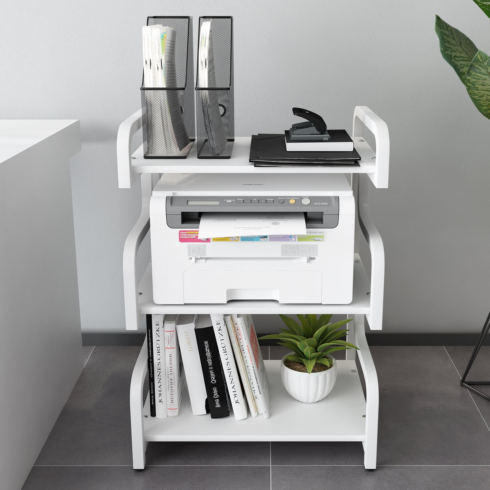 【Neat and elegant appearance】Its unique design, color and suitable size can create a better and more elegant appearance. You can use it as a storage shelf or printer shelf to decorate your office or home, or you can place potted plants on the top floor to decorate the room 【Frees up more space】our desktop printer stand comes with a 3-tier design, allowing you to place Office Supplies on the middle tier while the top or bottom layer can securely hold a printer/desktop, effectively helping you get rid of cramped Office space and creating a more comfortable working environment 【Multi-function】multi-layer storage shelf can be used in different places, put printers and other office supplies in the office, can also be used in the study, put the computer host and files. You can also use storage racks to store daily necessities. Its purpose is up to you. 【Stable and Durable】the arc design on both sides enhances the stability, the thickened steel frame is sprayed with plastic, the pipe wall is thick and stable, sturdy and durable, and has a strong load-bearing capacity 【Easy installation】the package contains an assembly instruction, which can be installed within half an hour according to the steps, which is very convenient and can be easily completed by one person.