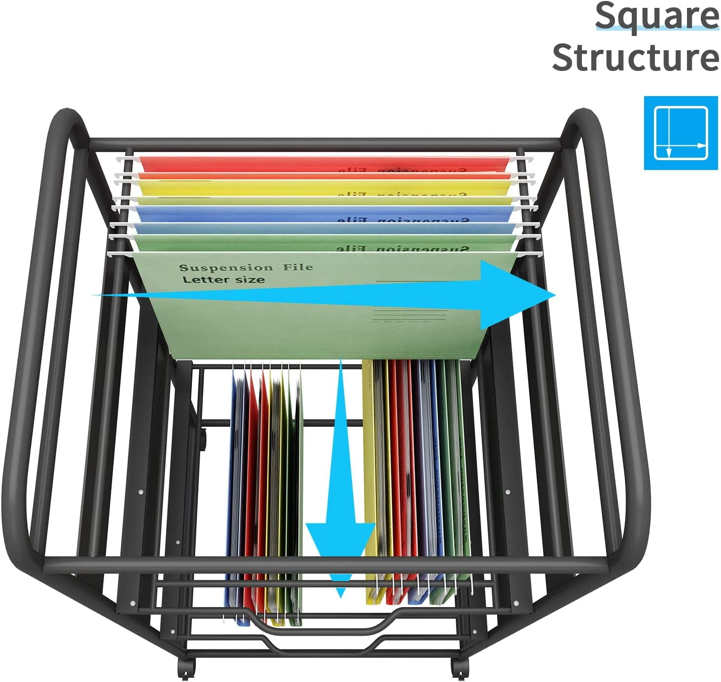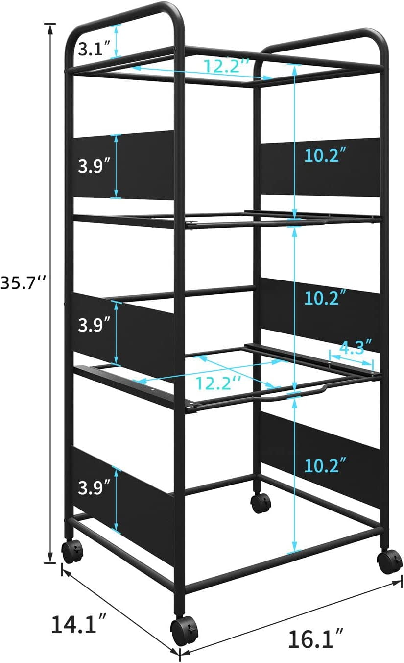 【Convenient Hanging Folder Cart】Special for letter size, square size can choose two different directions to hang files, each layer of frame can perfectly accommodate letter sized folders. 【Quality Metal Material】The movable file hanger cart is made of high quality metal material. Each steel pipe is 0.8mm thick and can bear 20lb pressure each tier. 【Pull-Out Design】The rolling file cart is convenient to take and put folders by the drawer-design.Compared with other fixed hanging file cart, you can find things easier and quicker by pull out the drawer. 【Anti-Slipping Screws】There are four anti-slipping Screws on each tier that can prevent drawers from accidentally falling from the front or back during use. 【Caster Wheels】With four lockable wheels, the hanging folder cart can be moved everywhere you want in home or office. Also the 360° swivel wheels ensure smooth transportation, and the lockable design help keep stability in one place.