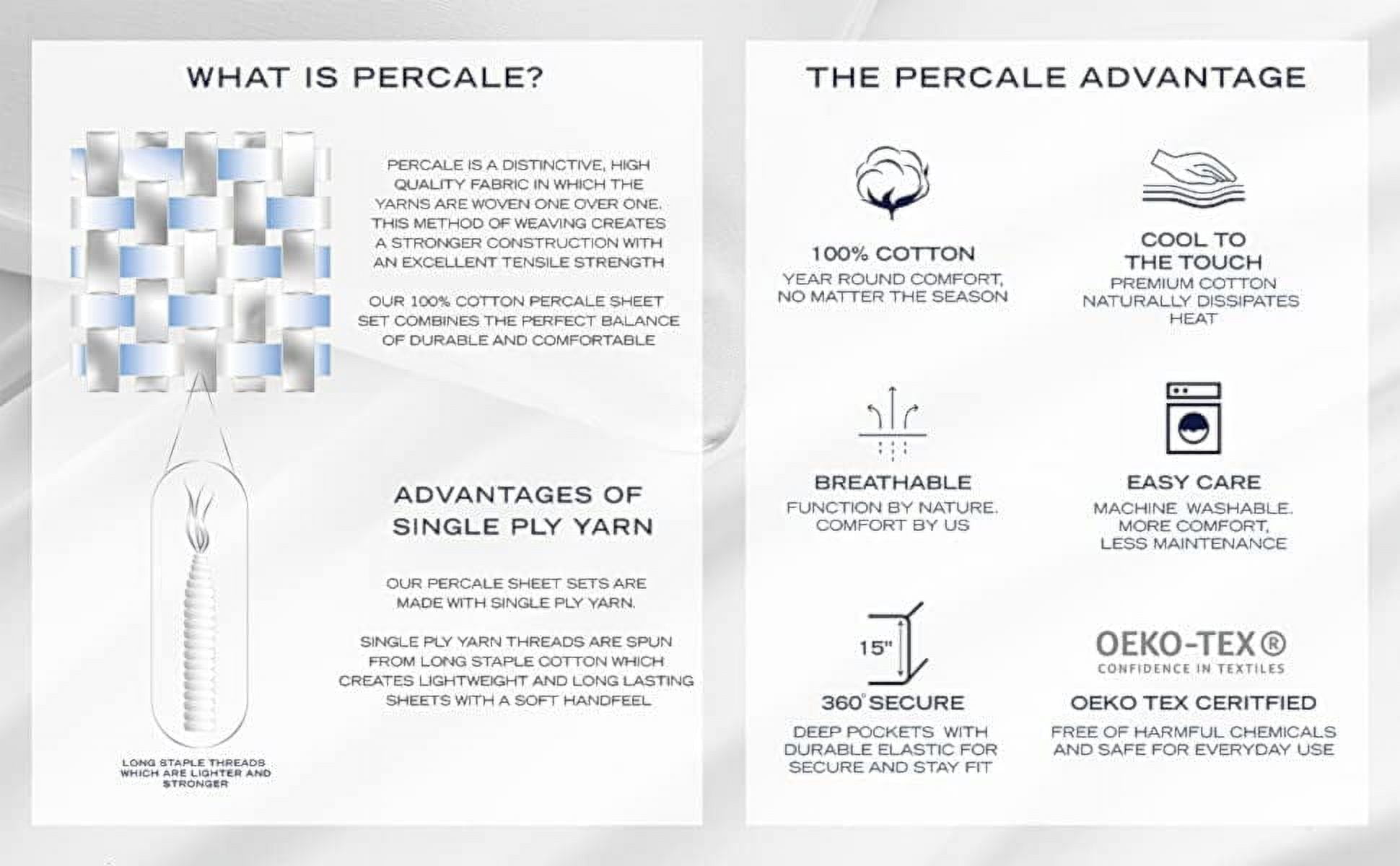T200 Percale INCLUDES: (1) flat sheet, (1) fitted sheet, (2) pillowcases MATERIAL: 100% Percale Cotton FEATURES: Constructed with 200 thread count crisp and breathable percale cotton. Fully elasticized fitted sheet prevents slipping and ensures a perfect fit for mattresses up to 15″ deep DIMENSIONS: Flat Sheet: 90″ x 102″, Fitted Sheet: 60″ x 80″, Pillowcases: 30″ x 20″ CARE INSTRUCTIONS: Machine washable for easy care. Machine wash cold, separately. Delicate cycle. Tumble dry low. Do not bleach