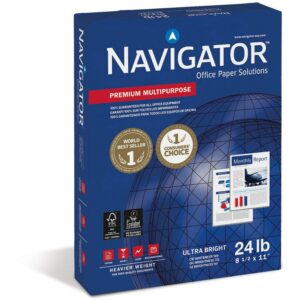 Navigator Premium Multipurpose 24lb is a superior quality paper, combining ultra brightness, opacity and an improved smooth surface. e result are sharp images with vibrant colors and excellent printing contrast. The microporous surface ensures faster ink drying and accurate absorption for high definition images. Designed with extra opacity, Navigator is perfect for double-sided and intense usage of color without show through. Ideal for: reports, memos, color graphics, data tables and more