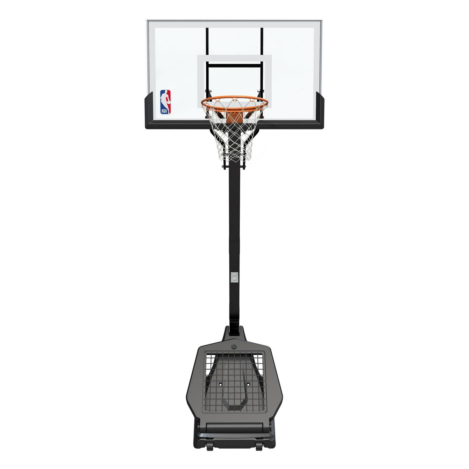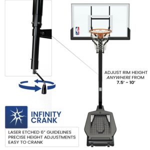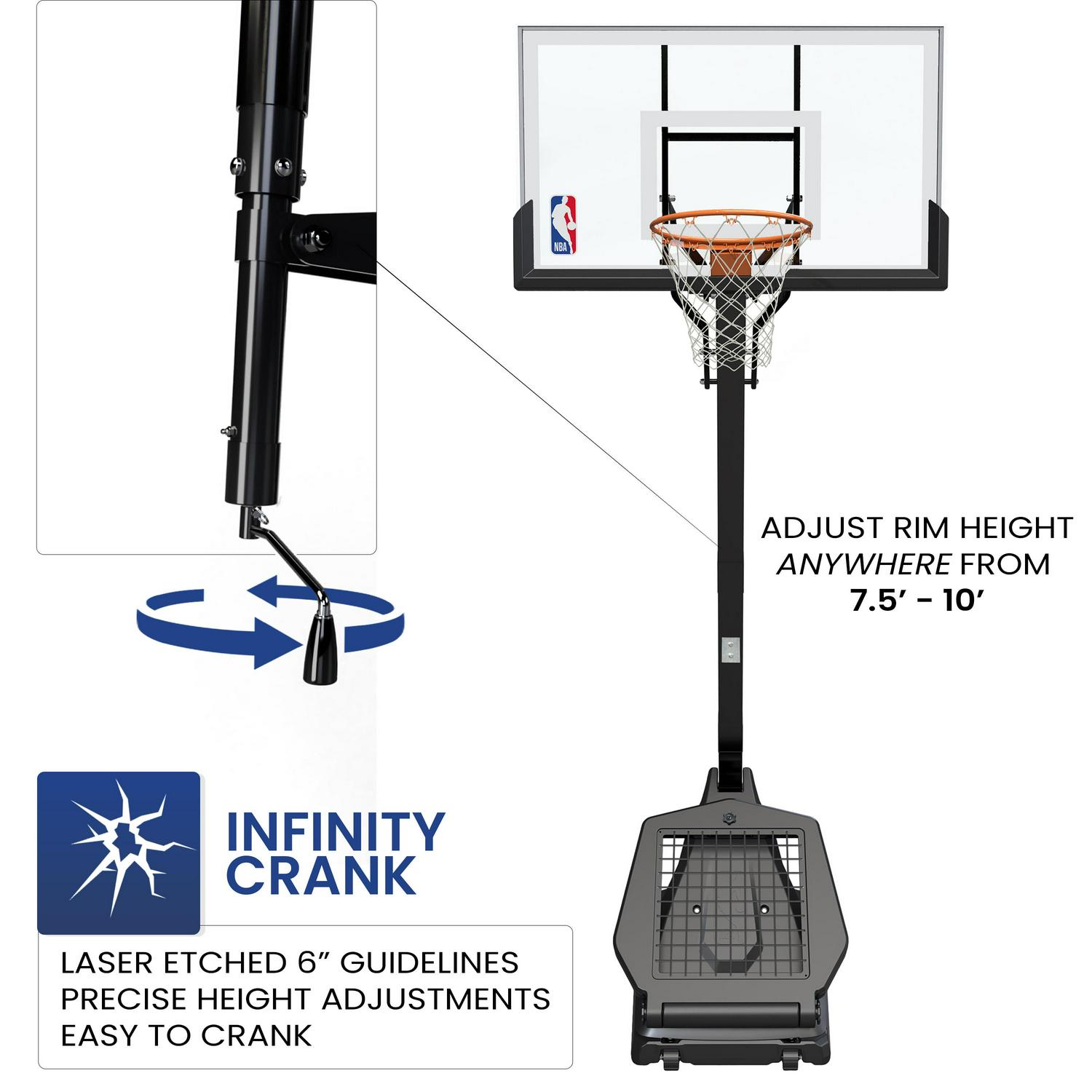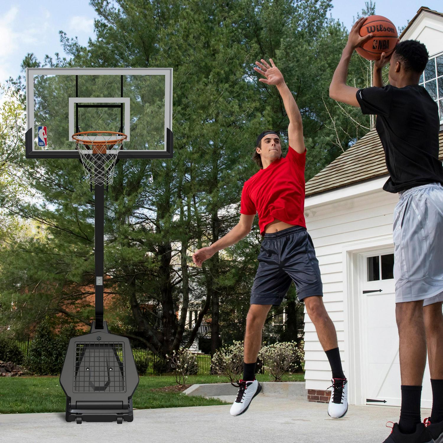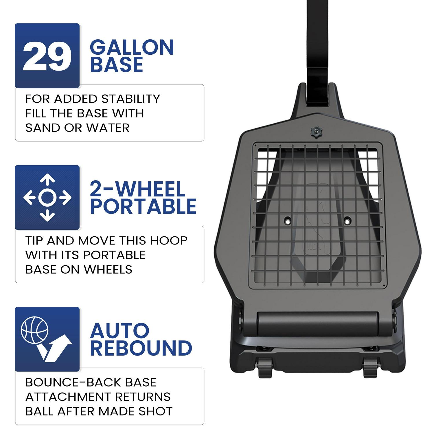 – Easy-to-Assemble. Backboard Material: Polycarbonate. Effortless adjust height using the built-in infinite crank system. The Base fills with 32 gallons of water or sand for stability (sand bags not included). The NBA Rebound Goal is base wheeled (2) for easy portability. The wew base design features Official NBA logo on matte black and designed for indoor and outdoor residential play. Tested to ASTM standards for quality assurance. All parts and tools for assembly included. 5 year limited warranty is included.