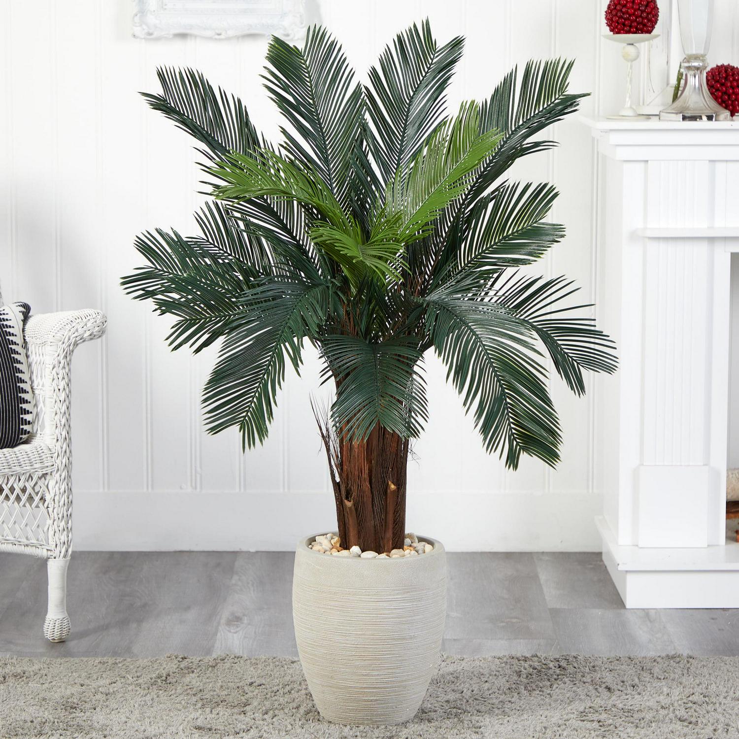 Elegant, lush green fronds explode up and out from a highly detailed, carefully crafted natural trunk. The lifelike artificial cycads tree has been paired with a neutral-hued sand-colored oval vase topped with natural river rocks. Add some tropical flair in your living room by placing this artificial cycads on a braided rug under a hanging lamp. UV resistant so good for indoor or outdoor use.
