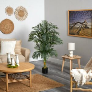 Create a tropical oasis that lasts year-round with this UV resistant Robellini Palm tree. Double stalked and standing just at 5.5 ft. tall, this tropical tree features 29 faux leaves for maintenance and mess-free care. Suitable for indoor or outdoor use. Pair pool-side with lounge furniture, or indoors with colorful textiles.