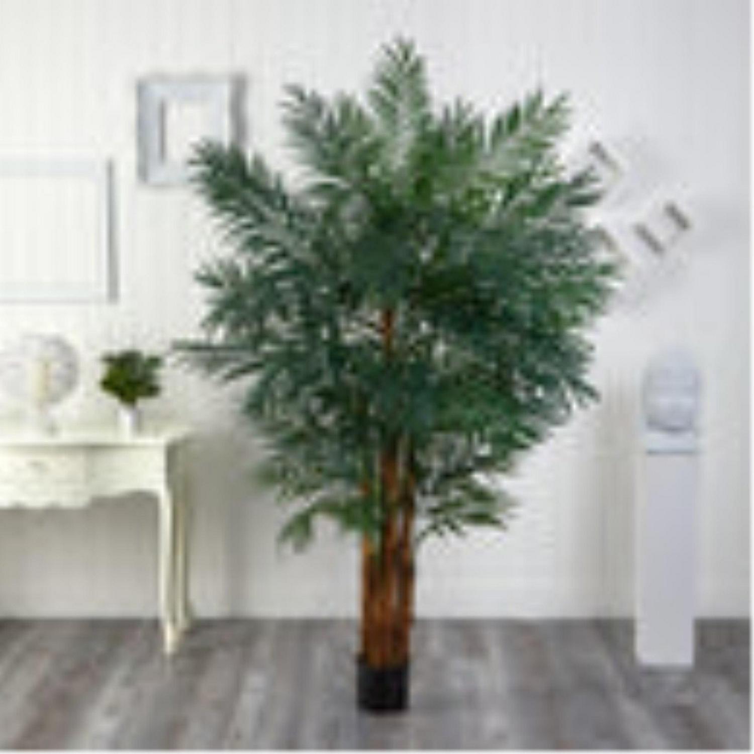 This artificial Areca palm tree will add a lush tropical feel to your living space. Its thin, leafy green fronds and warm chocolate colored stems are ideal for adding a touch of warmth and breaking up cold, stark corners. The controlled spread of the fronds creates a natural and delicate look that is sure to impress. Product Features: Potted artificial Areca palm tree. It has thin, leafy green fronds and warm, chocolate colored stems. Comes with a durable black pot for stability. No maintenance or care required. Recommended for indoor use only. Item will need to be reshaped when removed from the box. Care instructions: wipe clean with a soft dry cloth. Dimensions: 7’H x 32″W x 32″D. Material(s): plastic