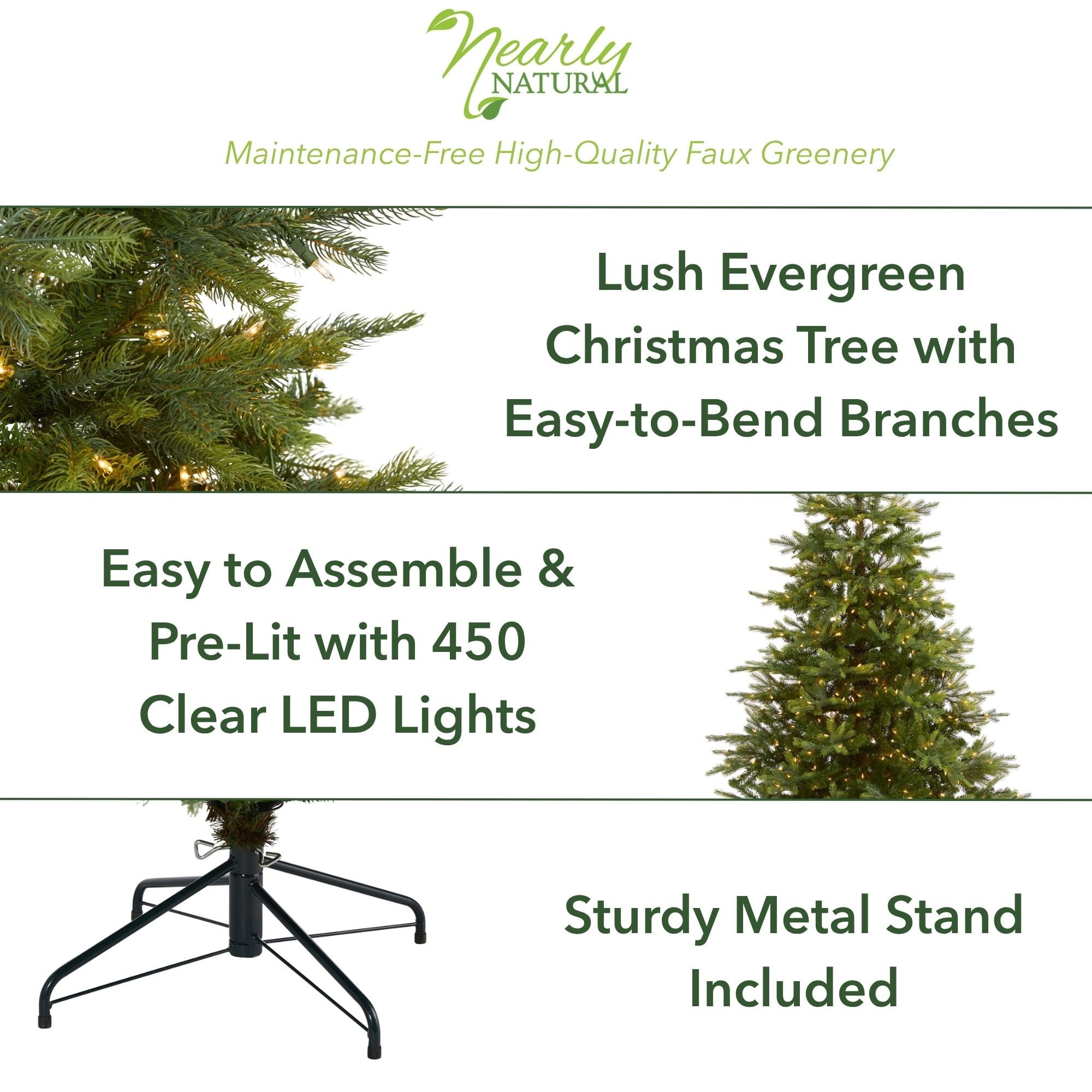 Nearly Natural Transform your home into a traditional Christmas setting this holiday with the help of this artificial Christmas tree. Easy to build and completely maintenance-free, this natural looking Christmas tree boasts spaced tiers of seasonal evergreens made up of 931 easy-to-bend branches, perfect for showcasing all your favorite holiday ornaments and decorative accents. Arriving pre-strung with 450 clear LED lights to eliminate tangles and carefully stabilized on a metal stand, this 7′ tall artificial Christmas tree will not only make decorating a breeze but ensure your home is always seasonally attired for years to come. About Nearly Natural Inc. – For over 75 years, Nearly Natural Inc. has been providing conscientious consumers with beautiful alternatives to natural decorations. Employing and advised by naturalists who understand the live plant world, Nearly Natural is able to recreate the most realistic-looking decorative items for homes, offices, and businesses. Driven by a true commitment to attention to detail, and natural philosophy, Nearly Natural strives to bring the most beautiful, unique, and striking faux plants and floral on the market.