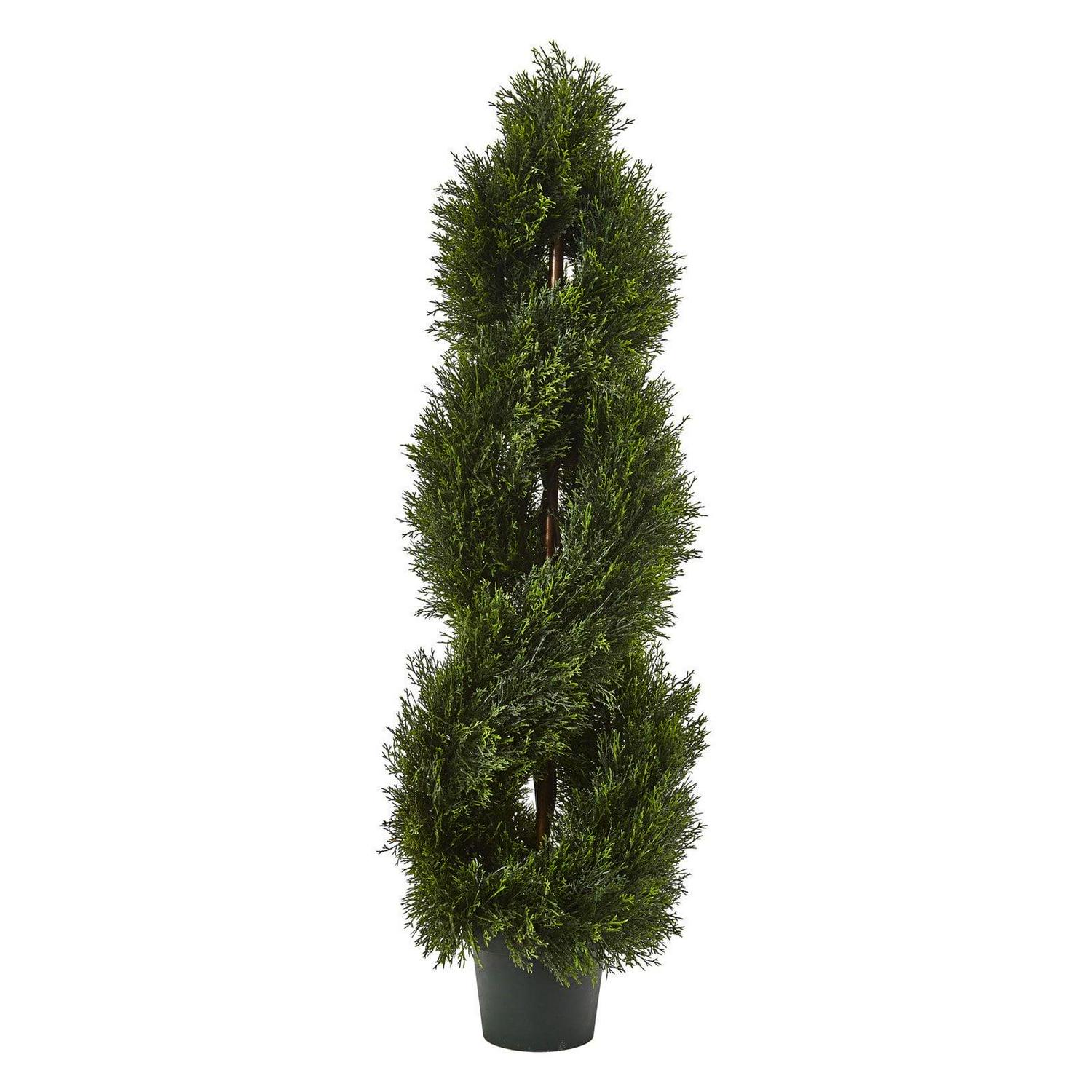 Nearly Natural Double Pond Cypress Spiral Topiary UV Resistant With 1036 Leaves Standing 4 feet tall, this faux Double Pond Cypress plant features two twisting stalks of greenery to form a spiral topiary arrangement. Adorned with 1,036 leaves, this floor plant is handcrafted in fine detail to mimic a true topiary. Place at the front entryway to greet guests or atop an entryway table for added height. Leaves are UV Resistant, suitable for indoor or outdoor use.