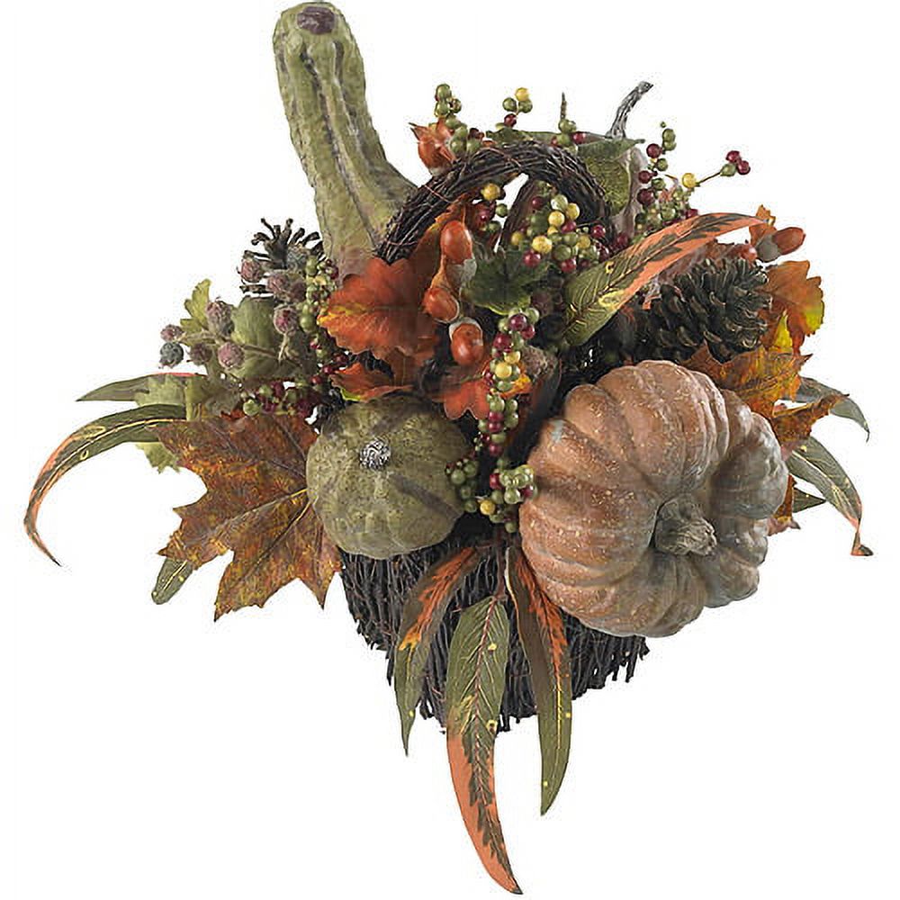 Pumpkins and berries Twig-wrapped base Measures 15L x 14W x 14H inches Reusable year after year Classic autumn table decoration