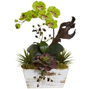 Nearly Natural Orchid and Succulent Garden with White Wash Planter