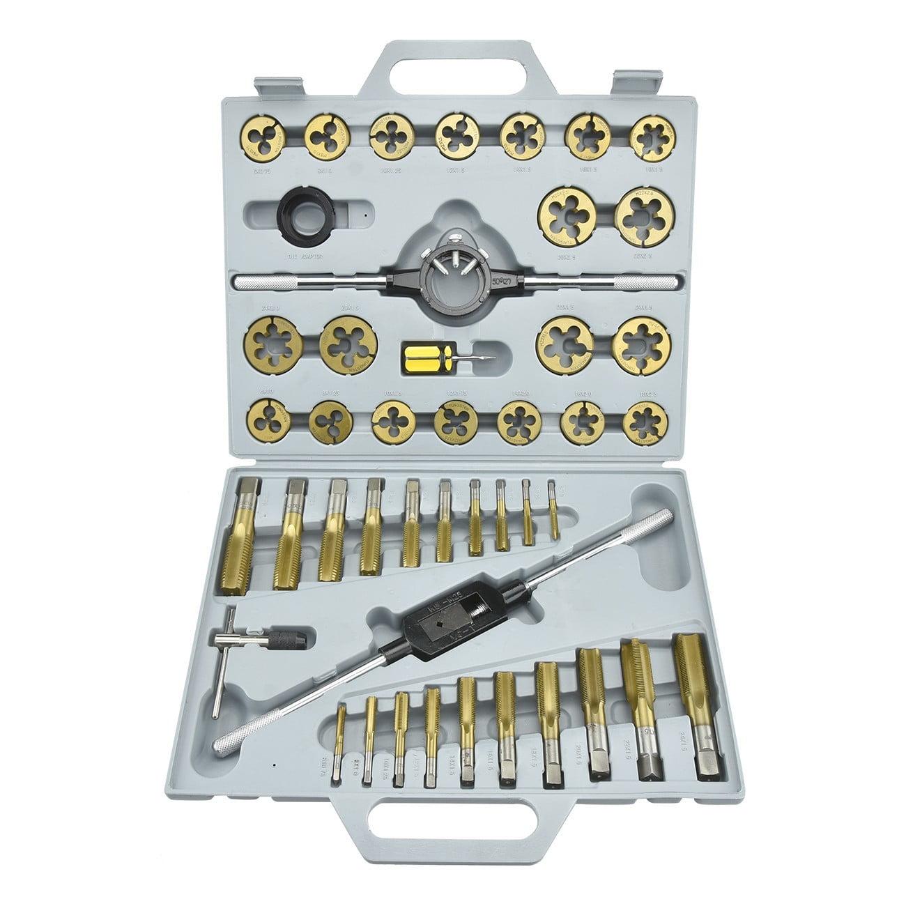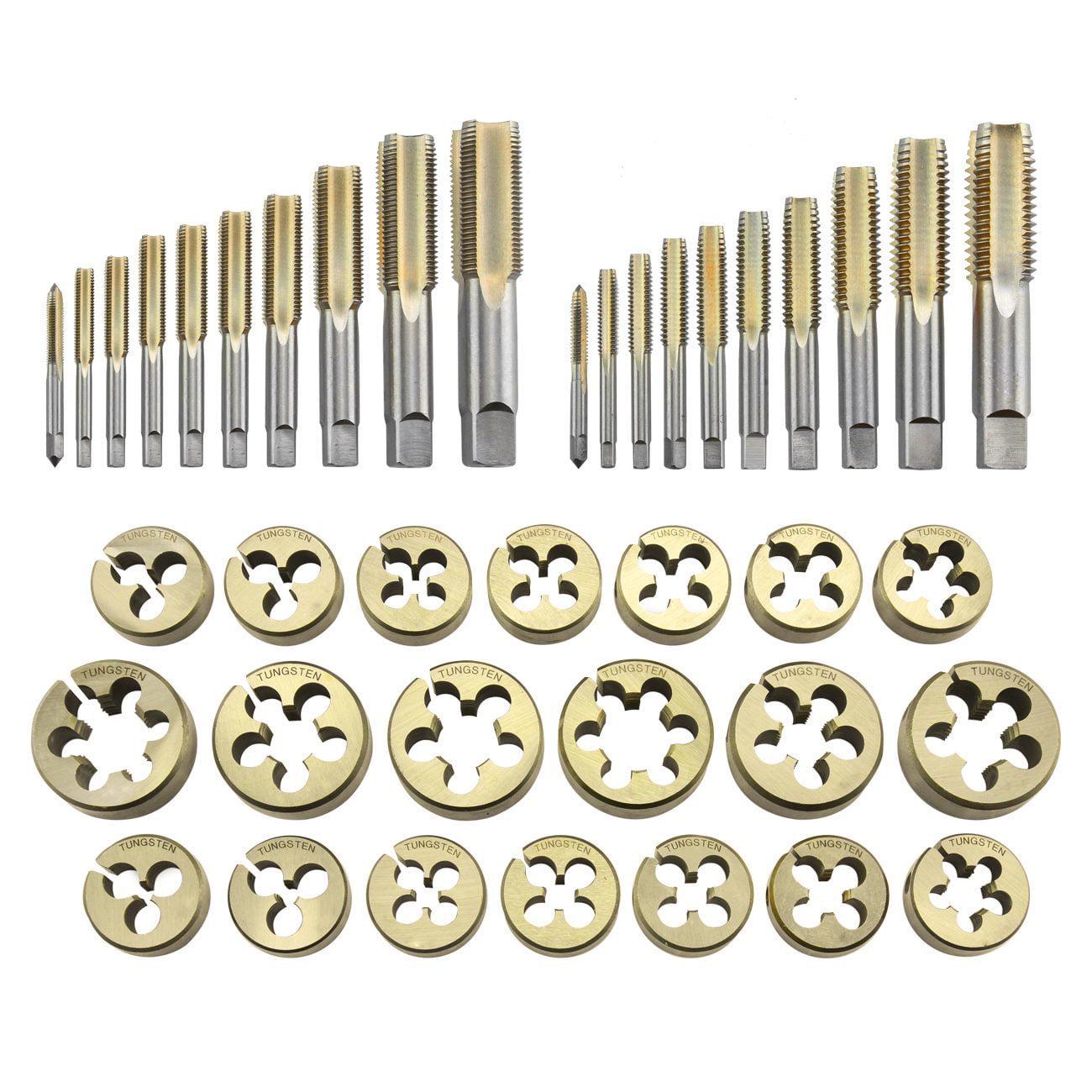 – THE RIGHT SIZE: This 45-piece SAE dies and taps kit has the right-sized piece for your threading needs. Our threading tool set includes UNC coarse-thread pieces in sizes 1/4-20 to 1-8 and UNF fine-thread pieces in sizes 1/4-28 to 1-14.