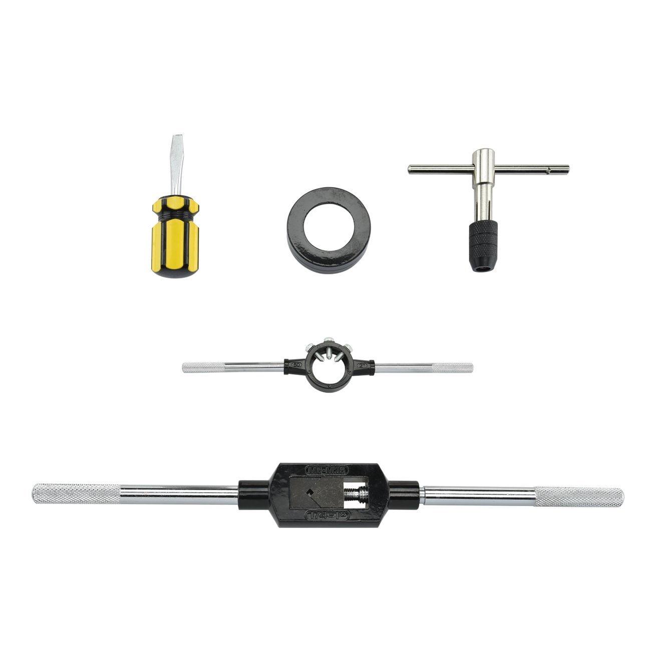 – CONVENIENT TOOLS: Our kit includes 1 die-stock handle wrench, 1 adjustable tap-handle wrench, 1 T-handle tap wrench, 1 die adapter, and 1 stubby screwdriver. This precise set comes in a heavy-duty blow-molded case for easy storage and travel.
