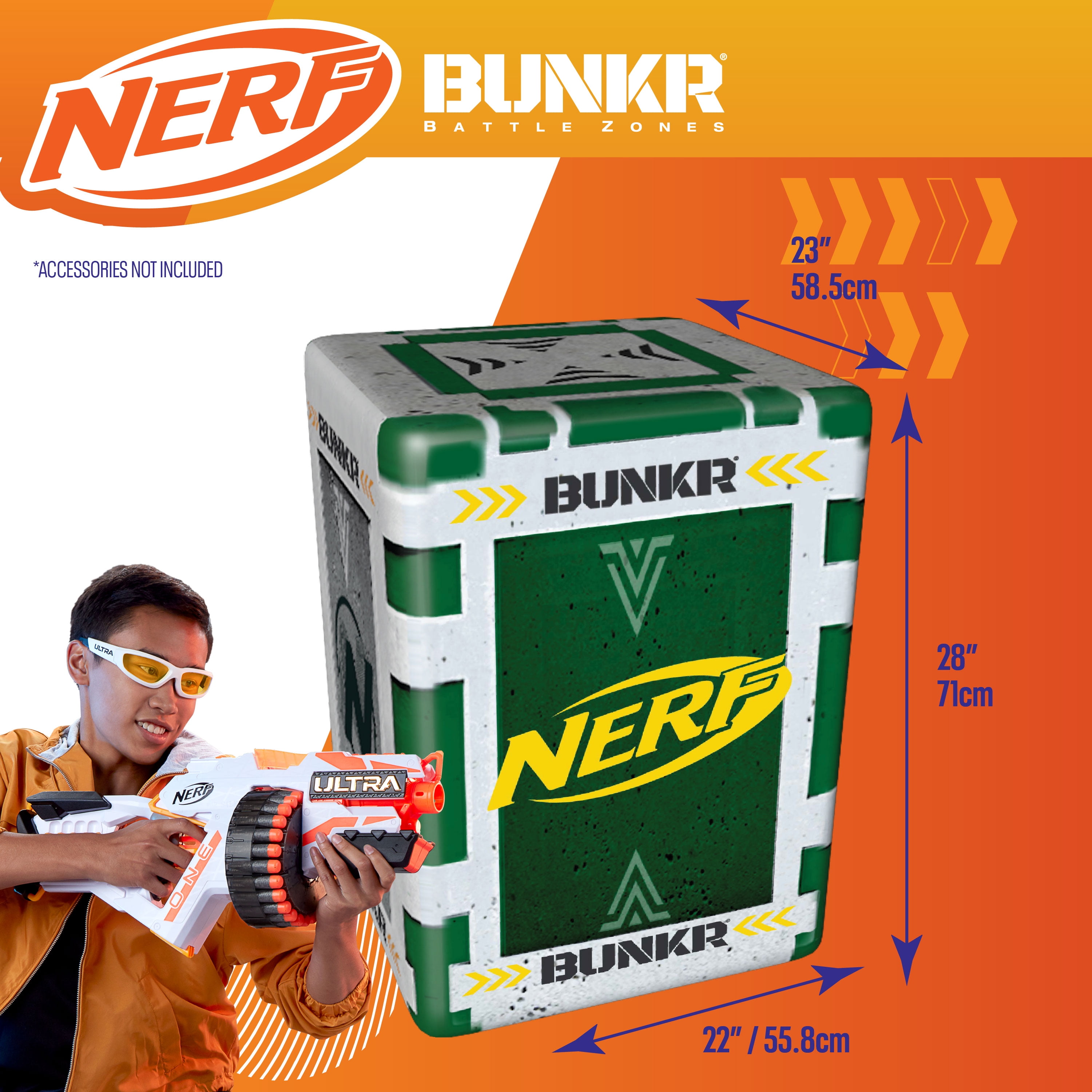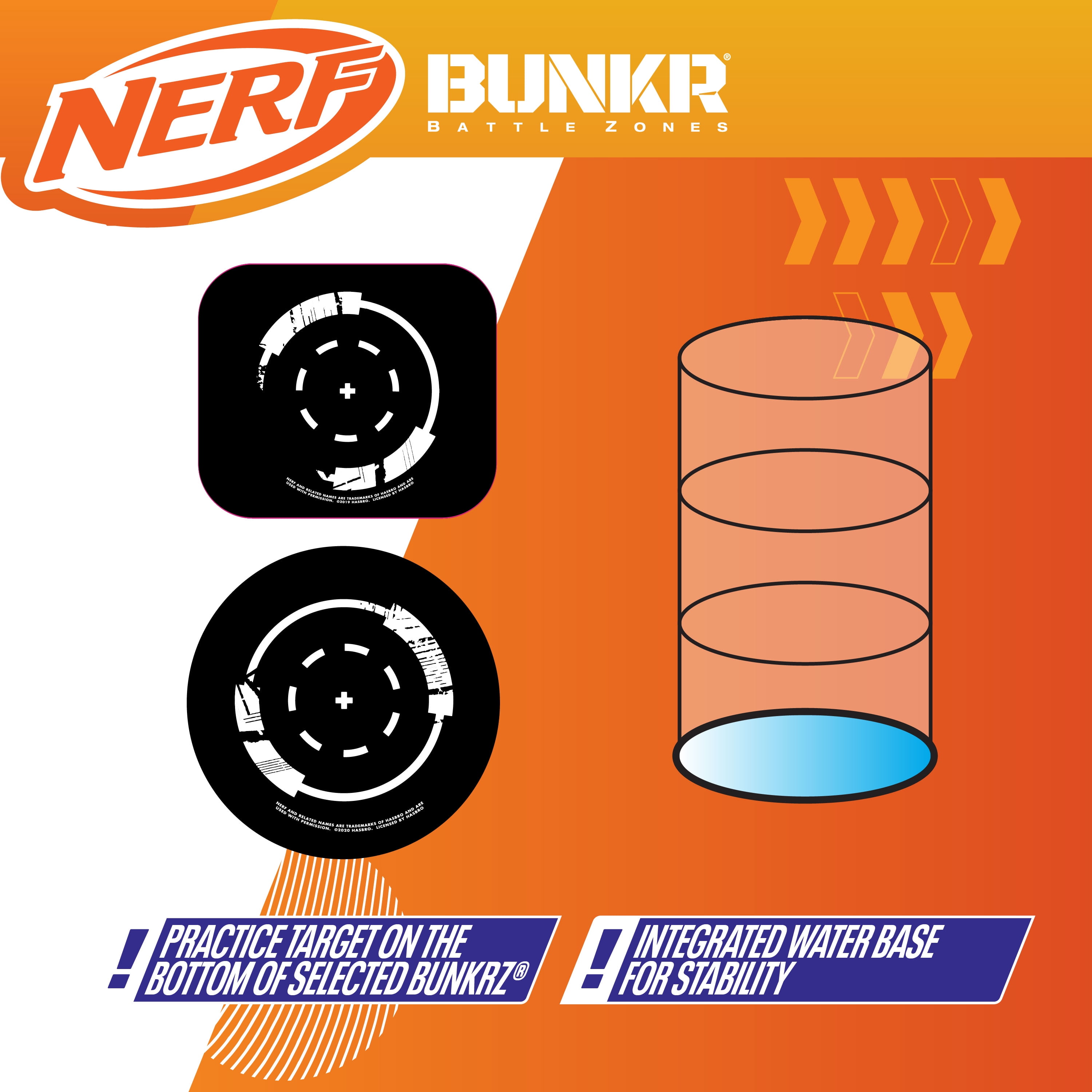 BATTLE ANYWHERE: Transform your surroundings into a real life NERF battlefield with these inflatable NERF BUNKR shield barricades and covers! INFLATABLE NERF CRATES AND BARRELS: Ideal for NERF party, NERF war, dart blaster play, laser tag, gel blasters, splatter blasters, and water blasters. Are you ready? HIGH VISIBILTY HD NERF GRAPHICS: Showcases bright colors and realistic features on NERF crates, NERF barrels and NERF cones INDOOR & OUTDOOR USE: Add water to the water base of your BUNKR Battle Zones for additional stability in windy conditions (Water base included in selected models only)