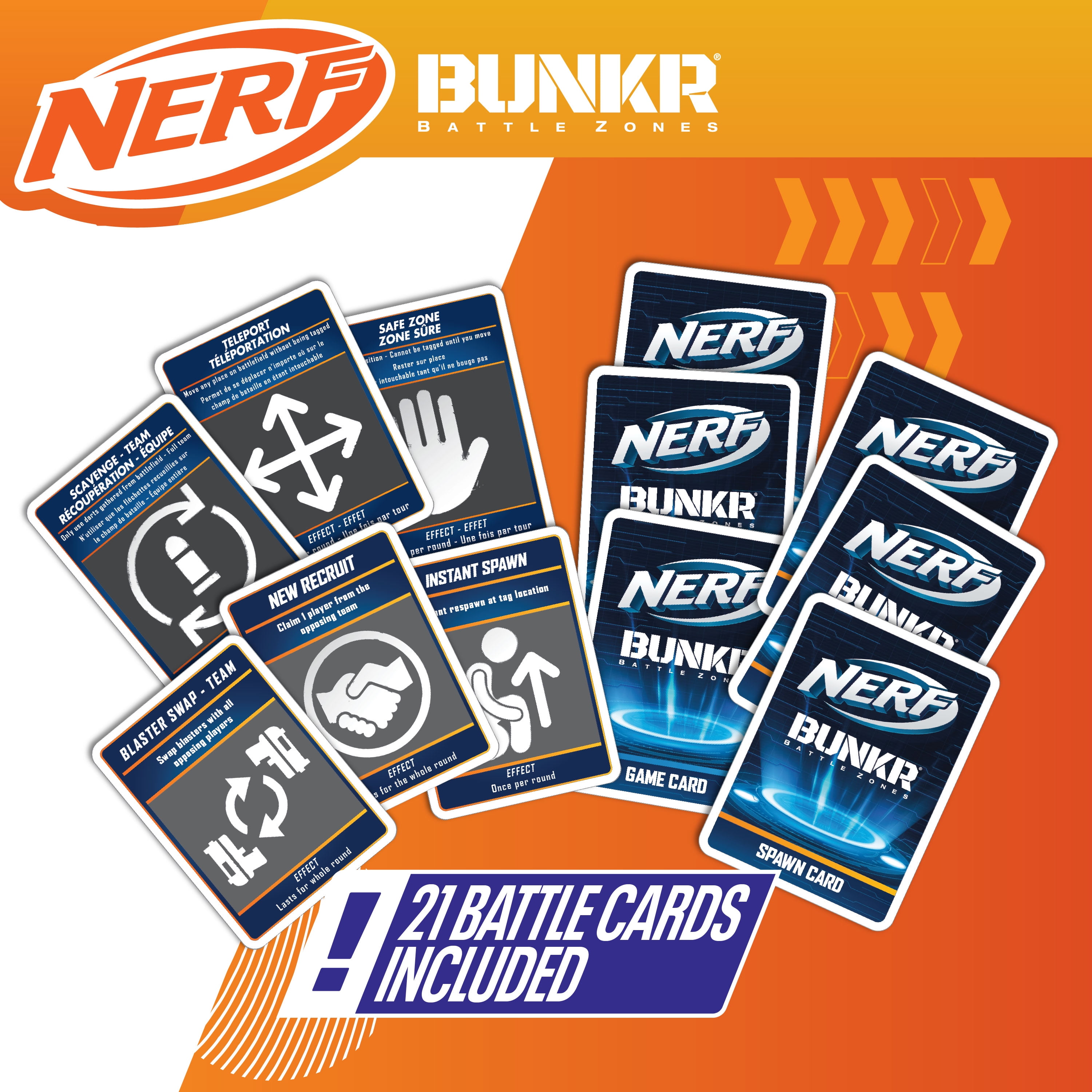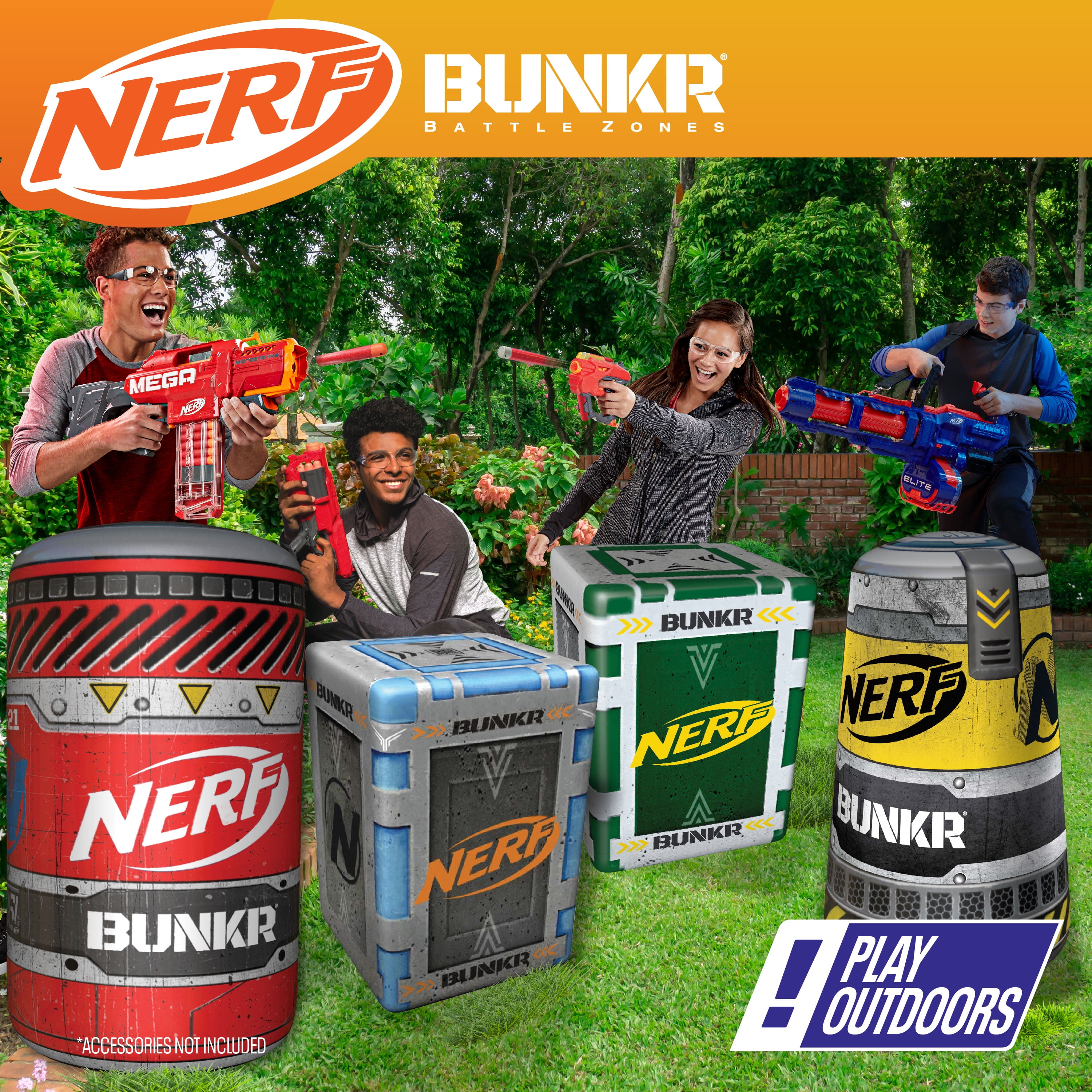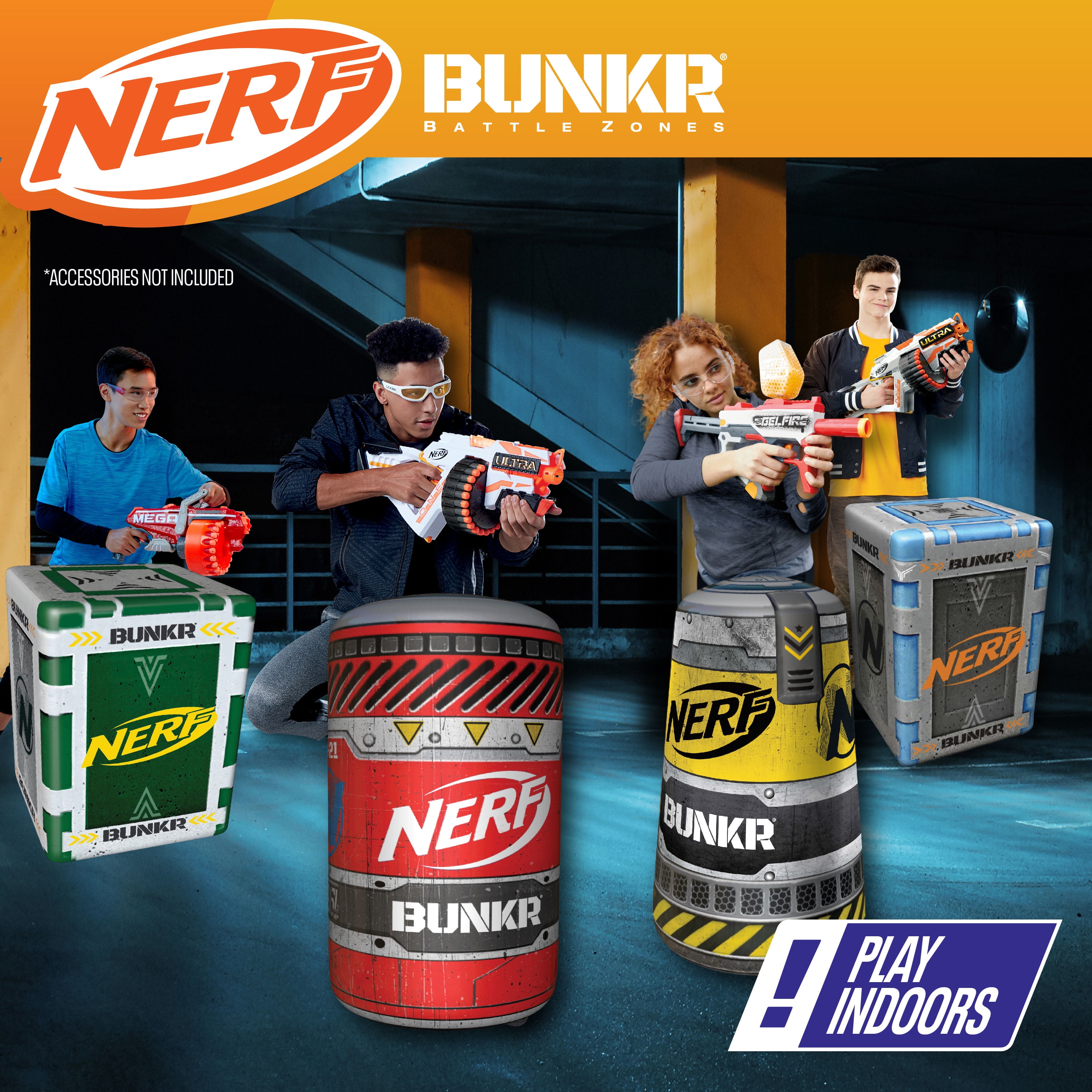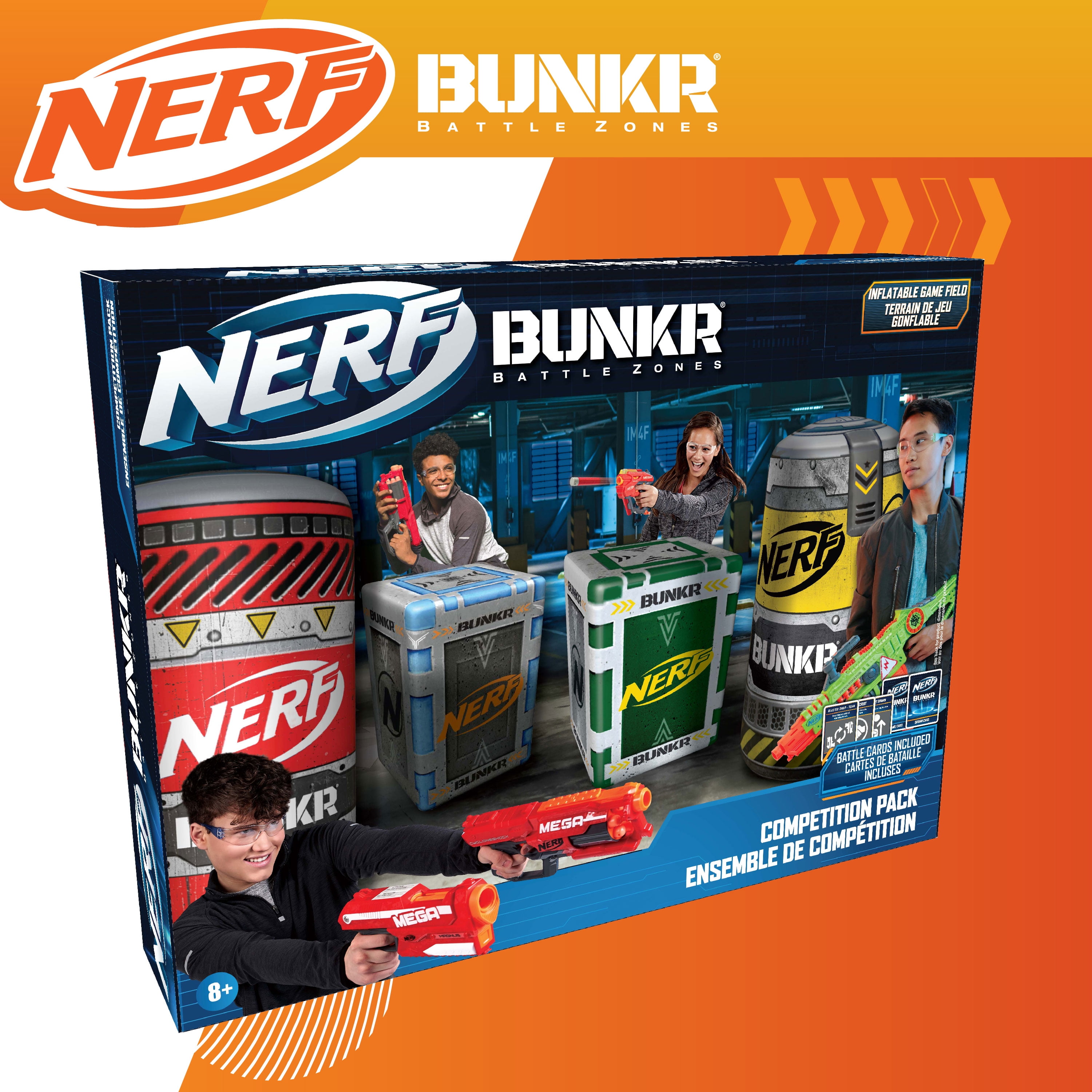 It’s Nerf or Nothin’! Nerf BUNKR BattleZones let blaster fans create and customize their own Nerf bunker battlefield with inflatable obstacles that provide great shield and barricade cover and protection for active players. Transform any environment into a giant Nerf battlefield or fort quickly and easily with the 4 piece Nerf BUNKR Competition Pack featuring Nerf inflatable crates and barrels. Take your Nerf party or Nerf war to the next level with BUNKR Battle Game cards included that provide strategy and tactics to make every battle one-of-a-kind. Nerf BUNKR BattleZone crates and barrels are easy to inflate with oversize 3 way air valves and are safe for indoor or outdoor play with the integrated Stability System in the base. BUNKRS are compatible with all foam dart blasters, foam arrow blasters, gel blasters, water blasters (including Super Soaker), and laser tag guns. Get up, get moving, get NERF BUNKR BattleZones for the best Nerf party or Nerf war!