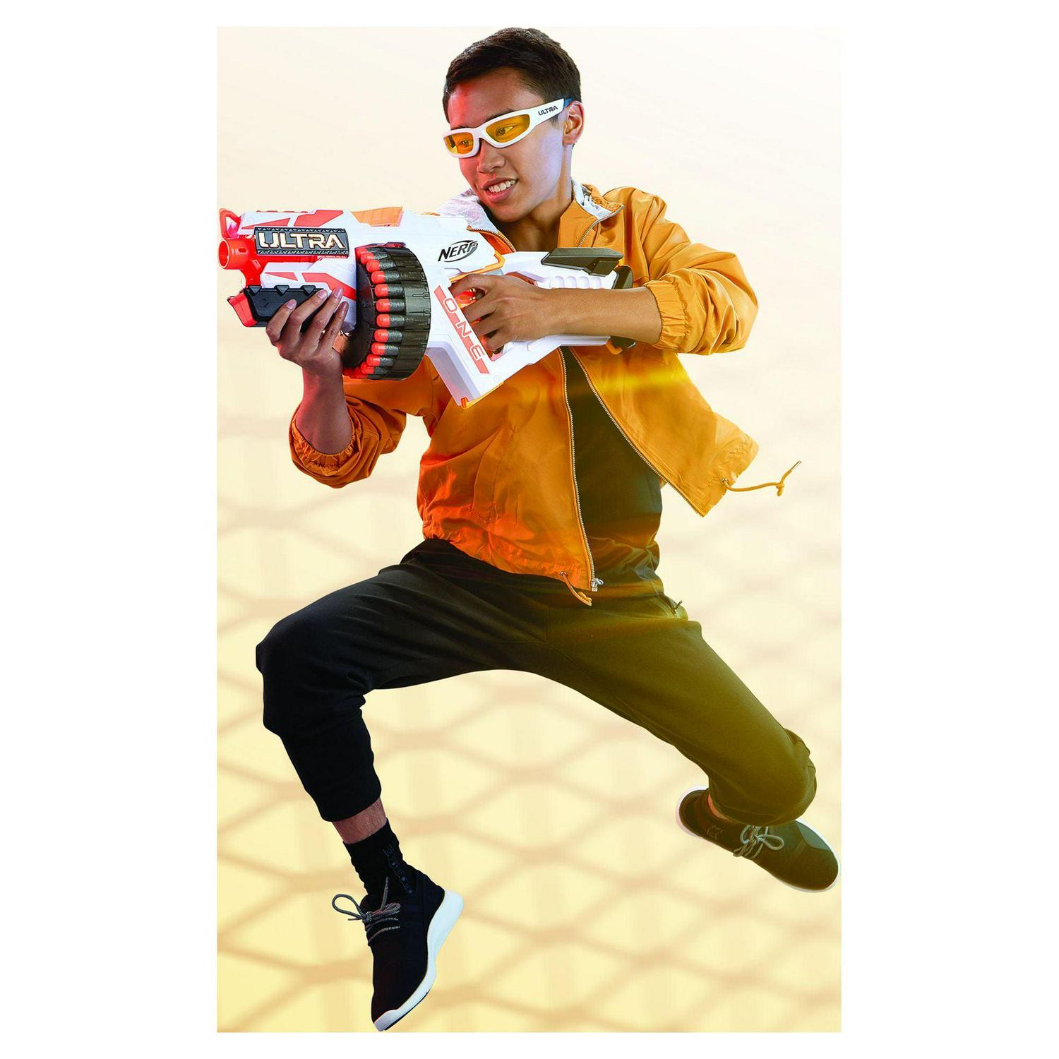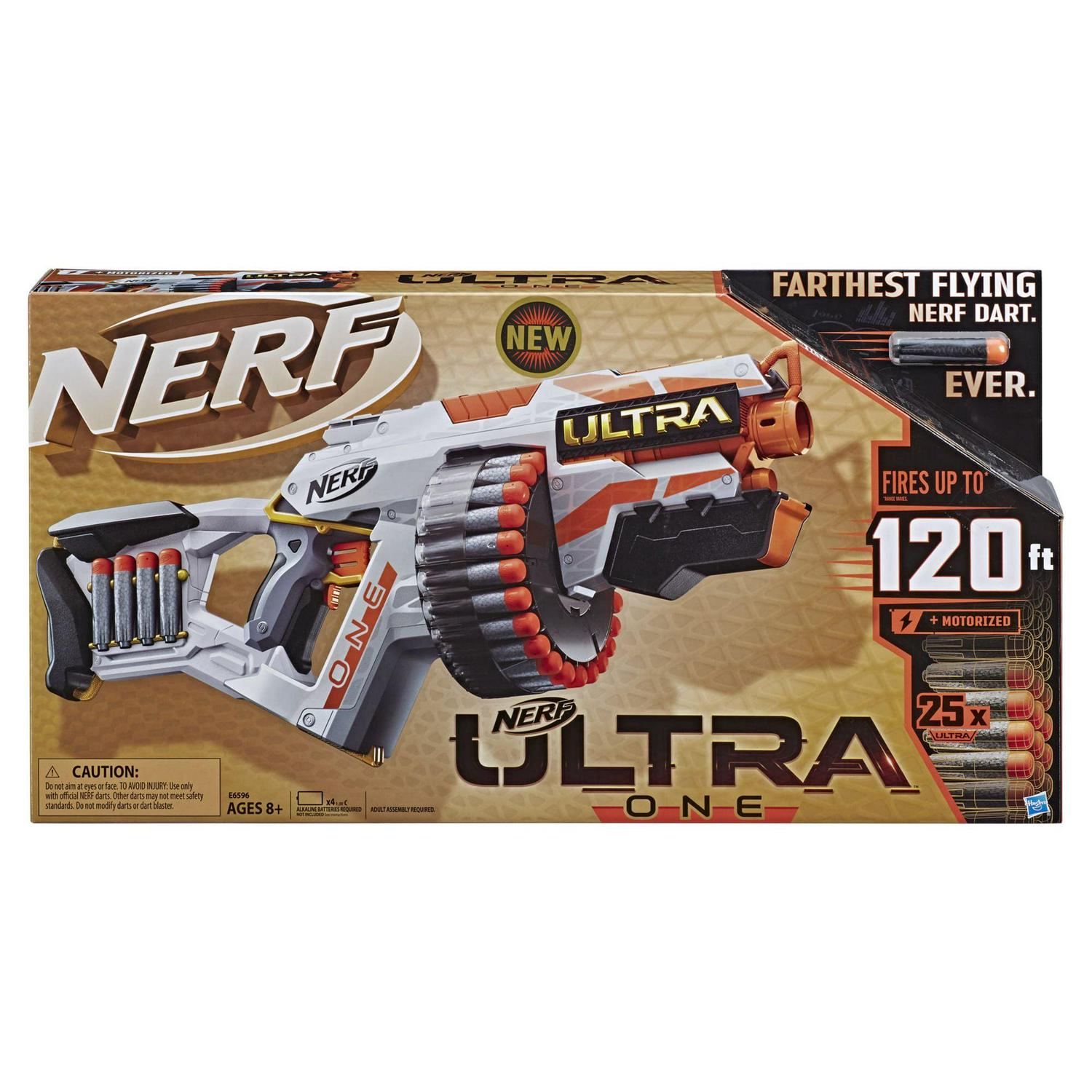 Experience Nerf Ultra blasters, the ultimate in Nerf dart blasting! These Nerf blasters have advanced design and performance to deliver extreme distance, accuracy, and speed. They include ground-breaking Nerf Ultra darts featuring an innovative flight tip, Aerofin technology, and Nerf Ultra foam. Take your Nerf battles to the next level with Nerf Ultra blasters and darts! Nerf Ultra blasters work only with Nerf Ultra darts. This Nerf motorized blaster has a high-capacity 25-dart dart drum and comes with 25 Nerf Ultra darts. Fire over 2 dozen darts with the high-performance advantages of this Nerf automatic blaster. Send darts flying through the air up to 120 feet (36 meters). There’s onboard dart storage for quick reloading. You have the skills and the expertise as a Nerf battler, now you have the toy blaster and darts for game-changing superiority. Kids toys like Nerf Ultra toy foam blasters are great gifts for teens who enjoy active play! Eyewear recommended (not included). Requires 4x 1.5v C alkaline batteries (not included).
