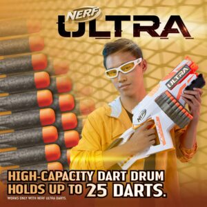 – NERF ULTRA ONE BLASTER WITH HIGH-CAPACITY DRUM: This dart blaster includes high-capacity drum that holds up to 25 Nerf Ultra darts featuring innovative flight tip, Aerofin technology. Works only with Nerf Ultra darts
