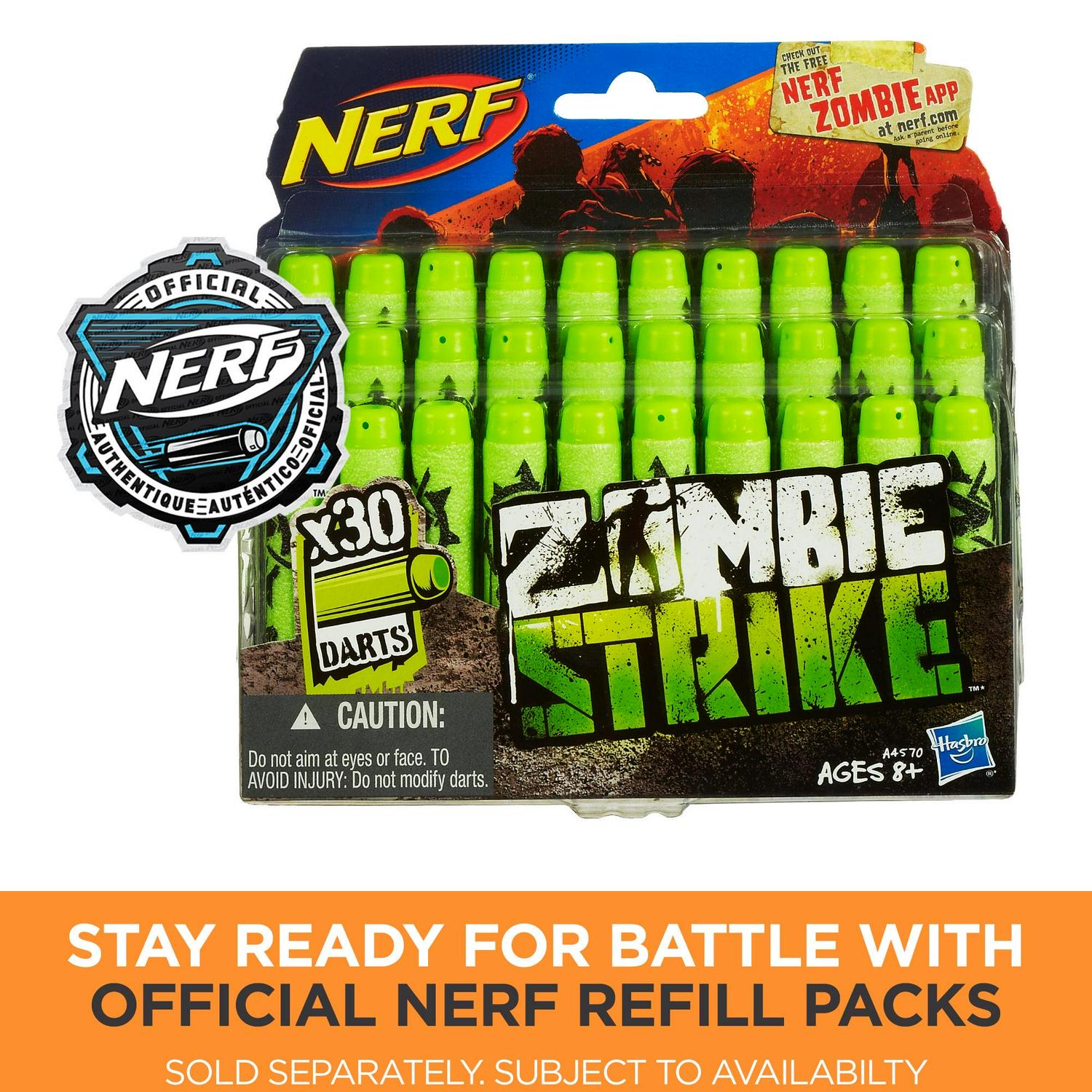 The zombie survivors are prepared for anything, with survival kits to defend against any zombie attack! With the Nerf Zombie Strike Survival System Scravenger kit, you’re ready for any zombifying challenge. Load one of the 12-dart clips into the Scravenger blaster and unleash a dozen darts in a row before you need to reload. Store the second 12-dart clip in the holder on the attachable targeting scope. Slide the tactical light onto a tactical rail to use in low-light situations. Stabilize shots by attaching the stock, which has a 2-dart blaster hidden in it, for a secret back-up blaster. Add the barrel extension to modify the blaster for distance targets. The lever-action Scravenger blaster features an on/off slam-fire button; switch the button to on position and keep moving the lever to fire all 12 darts rapidly. Stay ready for anything with the Nerf Zombie Strike Survival System Scravenger kit! Hasbro and all related properties are trademarks of Hasbro.