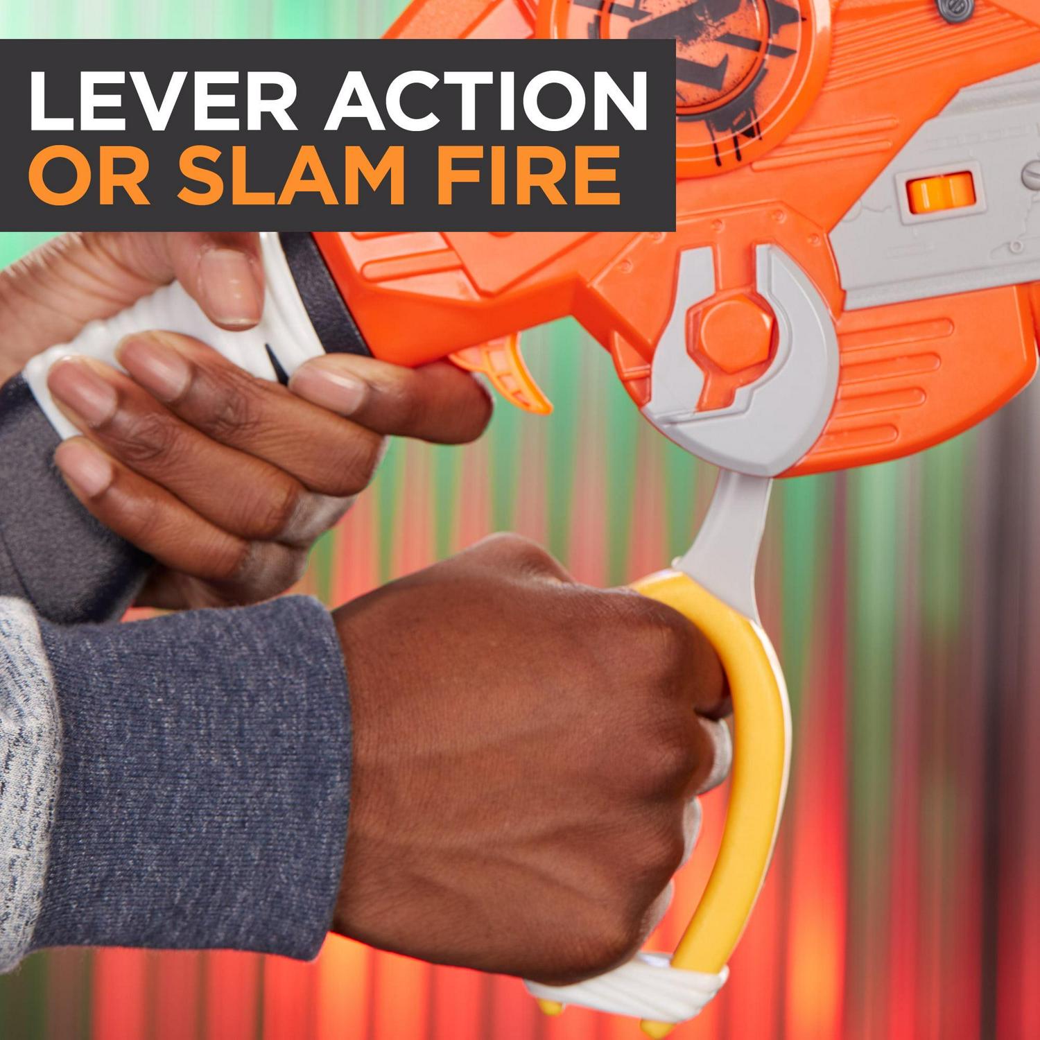 – LEVER-ACTION BLASTER: This Zombie Strike Nerf blaster shoot darts with lever-action blasting and switches into slam-fire mode so you can fast-fire an entire clip of darts.