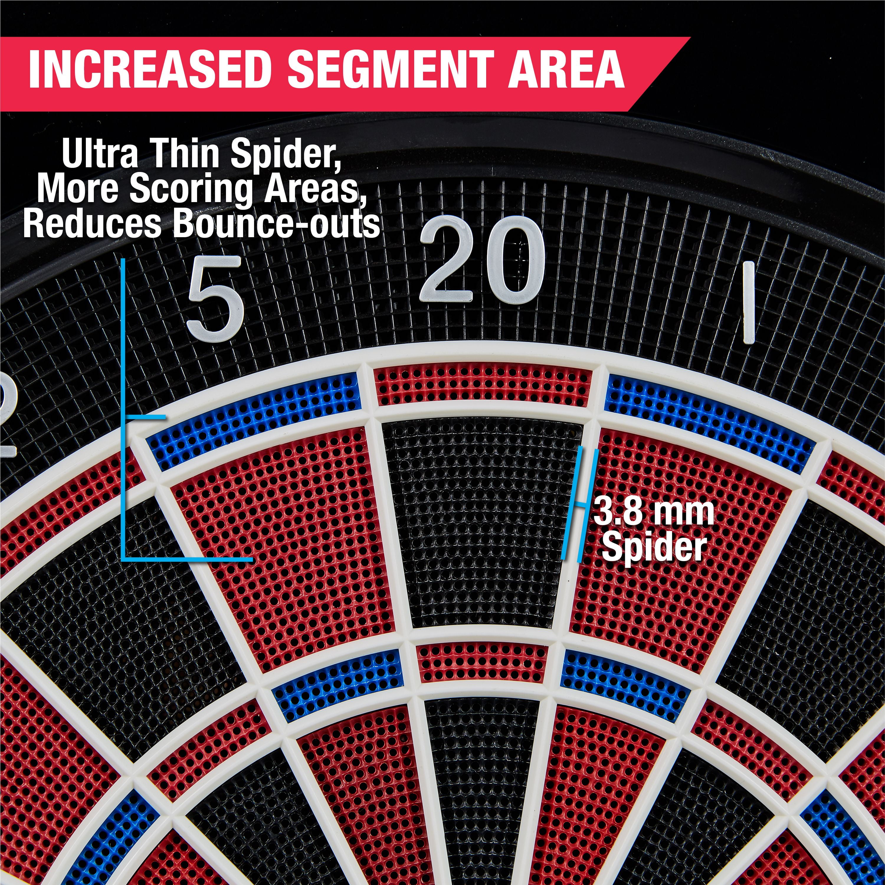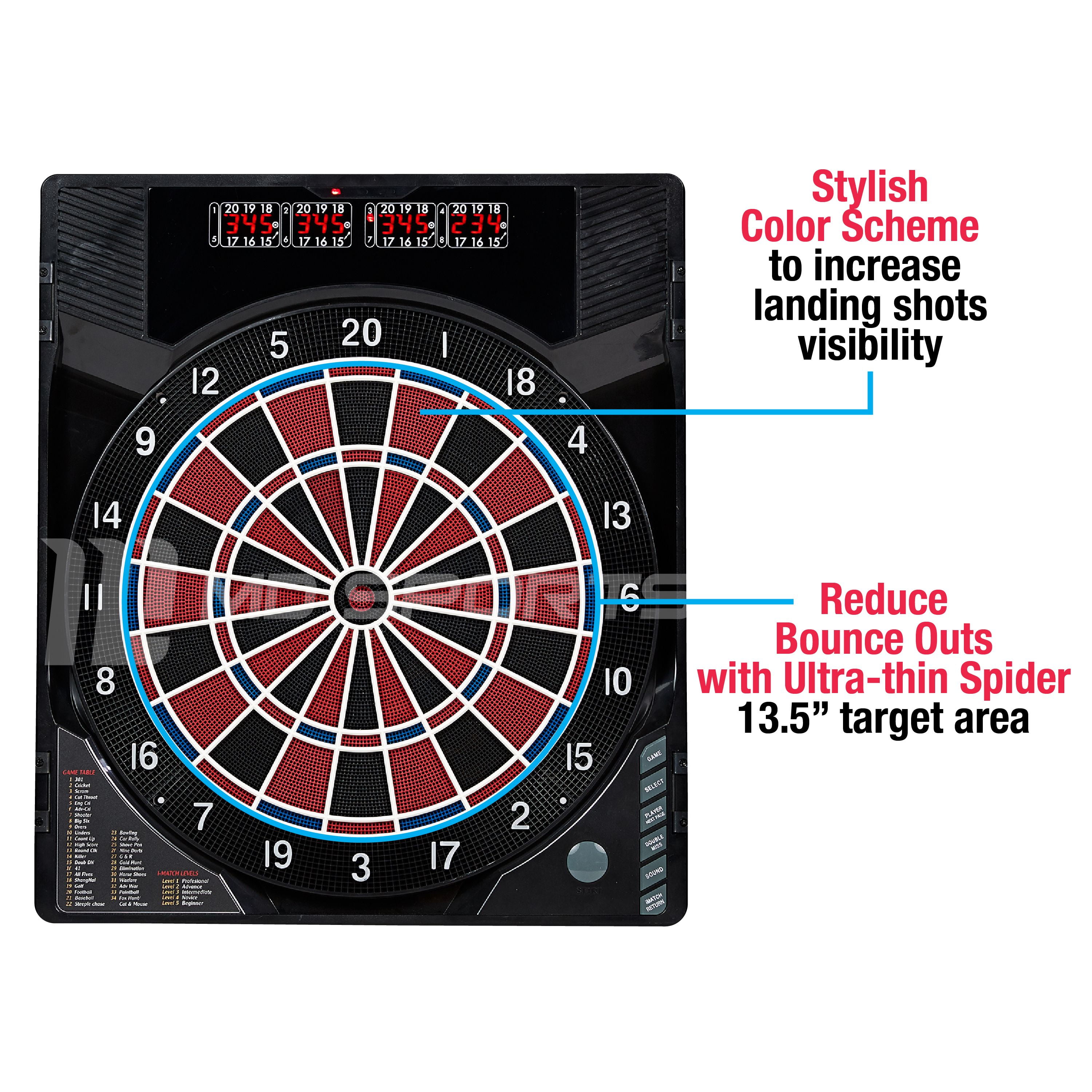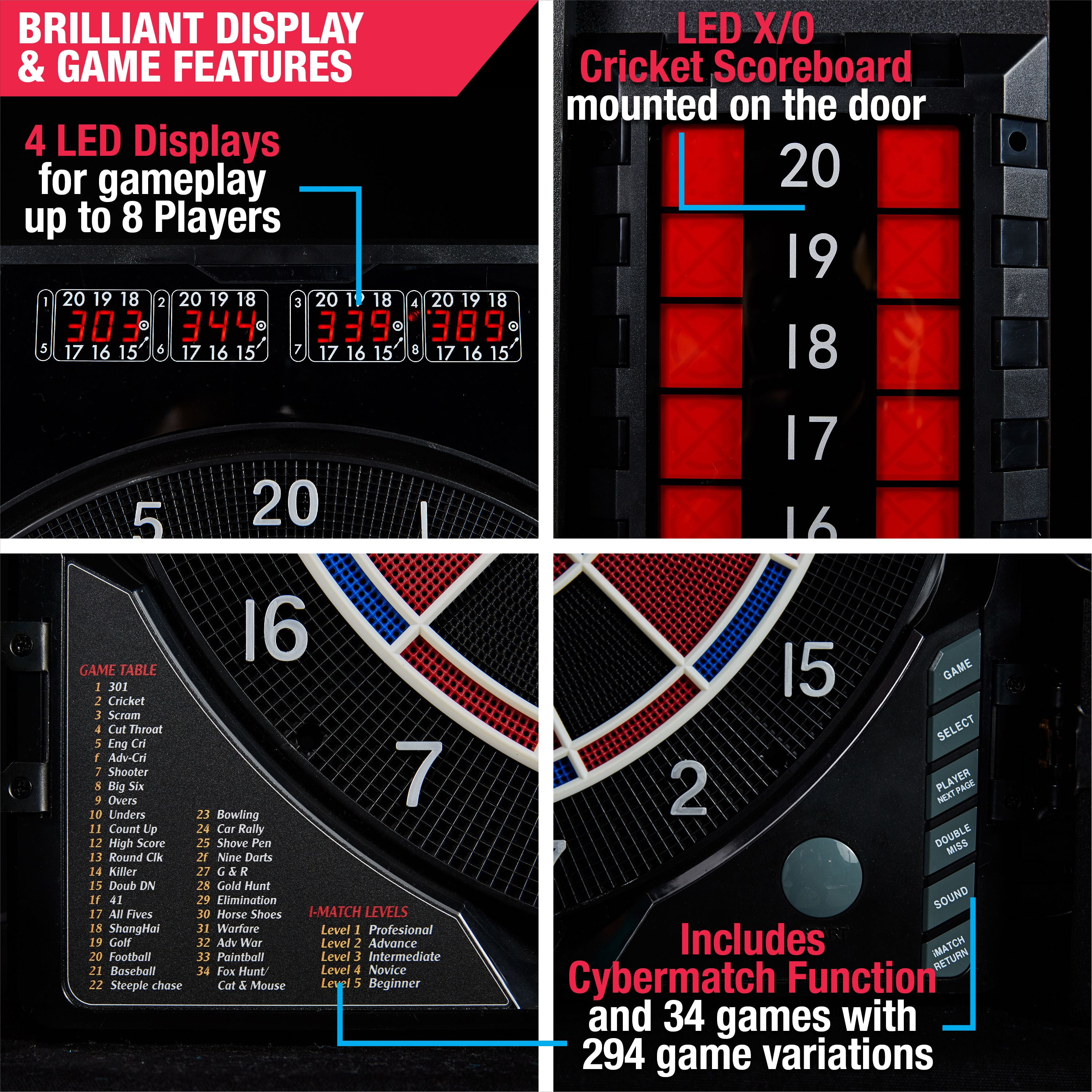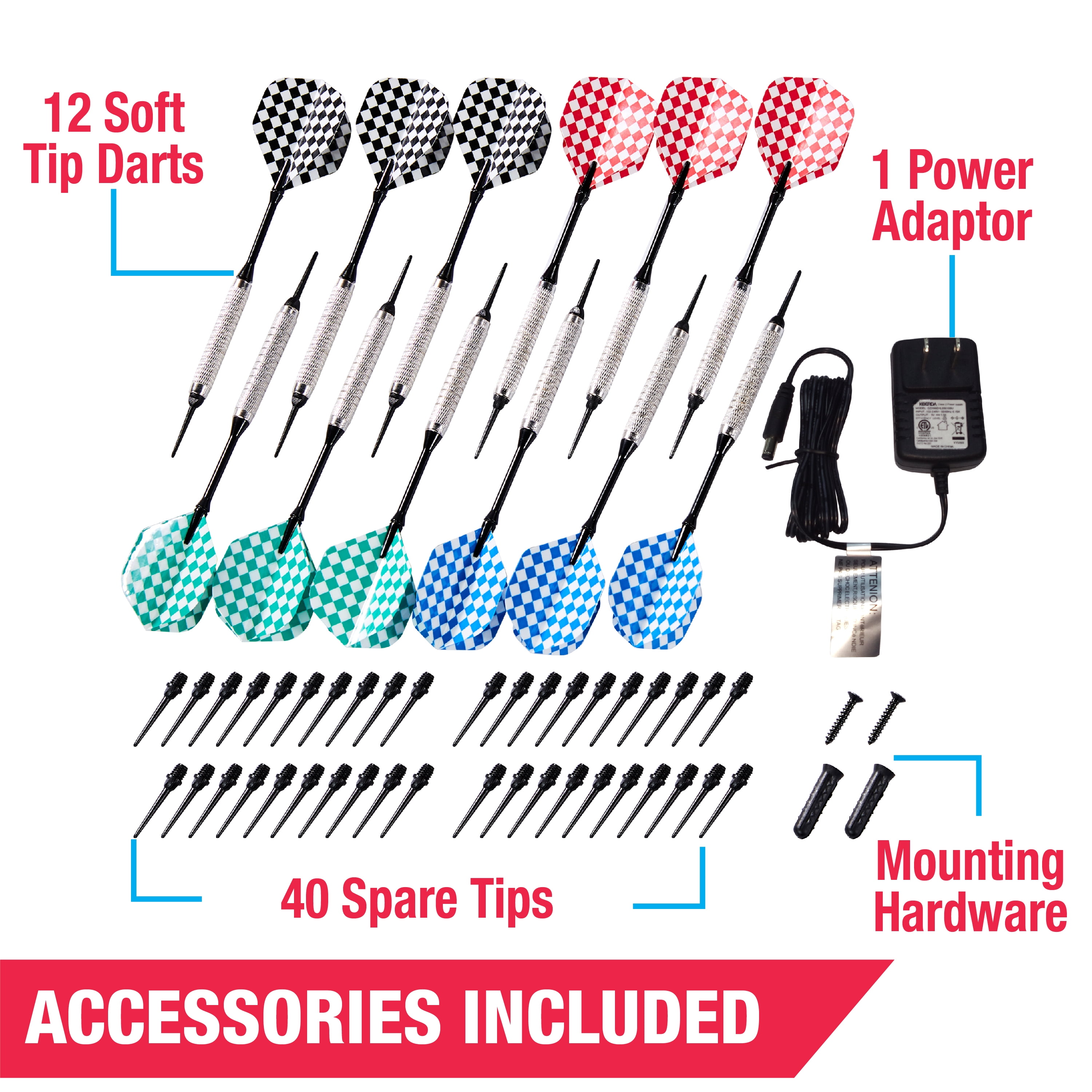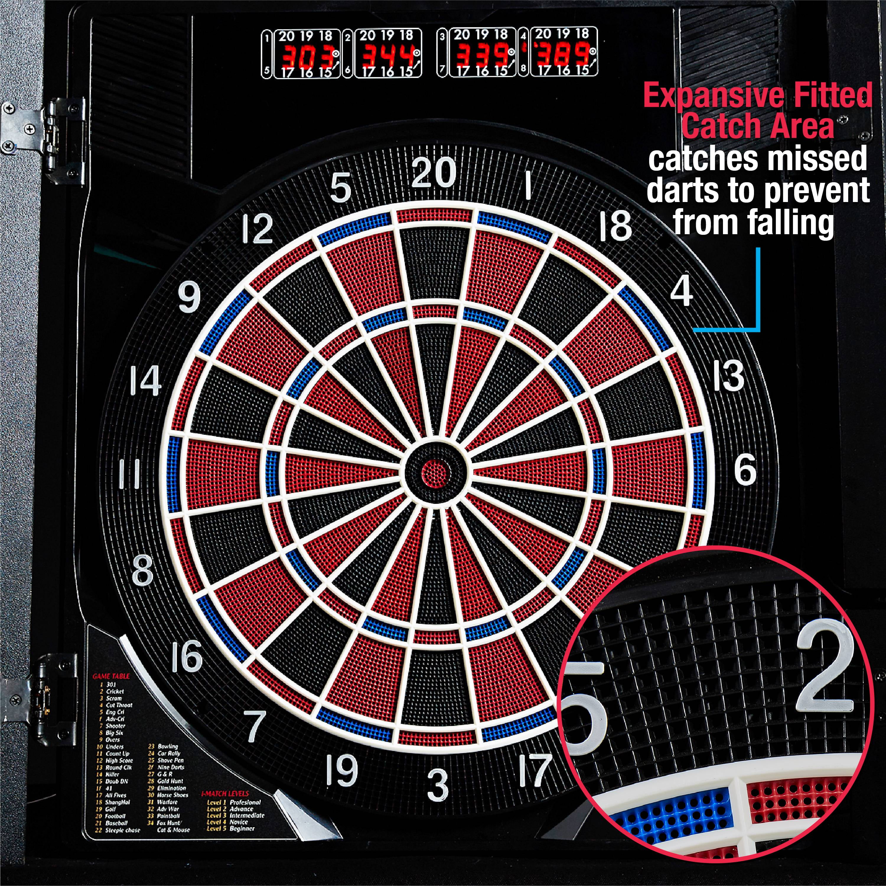 ELECTRONIC DARTBOARD CABINET & 12-SOFT TIP DARTS: This electronic dartboard cabinet with LED digital scoring and a standard size 13.5” target area comes pre-assembled and ready to play. Just mount it on the wall, open the cabinet, and let the fun begin CLASSIC PUB GAMES: This smart dartboard makes scoring 34 different pub games like Cricket and 301 easy. Play against the computer (5 Levels) or with up to 8 players in many of the games. Voice commands and indicator lights help track player turns ACCESSORIES INCLUDED: 12-Soft tip darts in 4 team colors are included (3-Blue team set, 3-Green team set, 3-Red team set, and 3-Black team set) each weighing 12g, plus 40 extra soft tip replacements. SMART DARTBOARD SCORING: The door-mounted scoreboard tracks 2-player Cricket games displaying X/O scoring as you close out the numbers. 4 LED displays track up to 8-player scores for 34 different games. Powered by the included plug-in adaptor STORAGE & MOUNTING: Built-in dart holster stores up to 12 darts Includes mounting hardware for most indoor walls, 4 extra mounting holes in the Catch Ring provides added security. The open cabinet provides 37.4” x 24” of wall protection SOFT TIP DARTBOARD: Made of perforated plastic scoring segments this standard size 13.5” dartboard target area for soft tip darts has a molded plastic spider divider and a Live Catch Ring to catch darts that miss the target area and reduce bounce outs