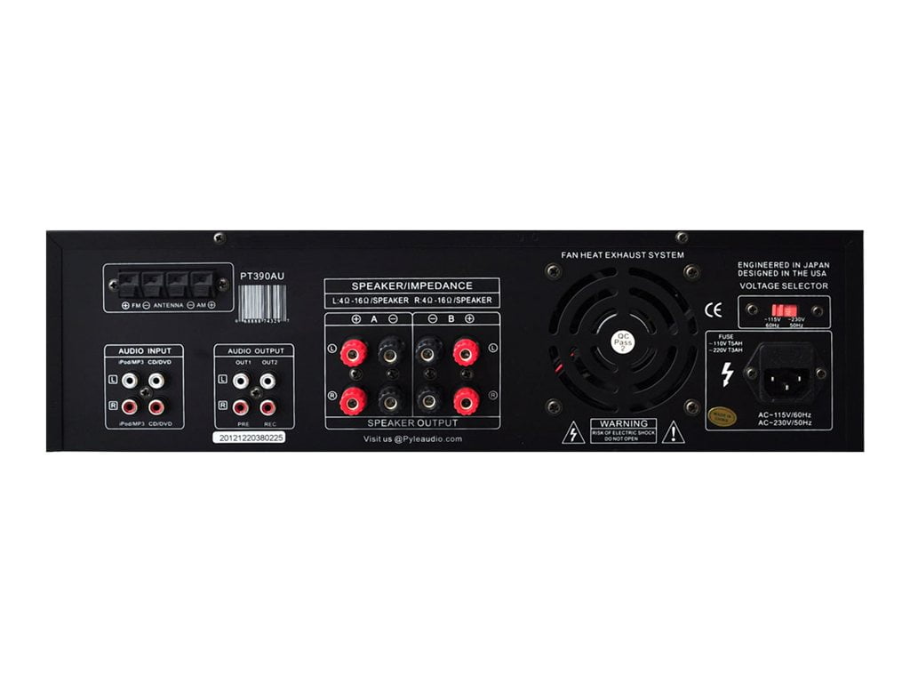 The **Pyle PT390AU** 300 Watt Digital Home Stereo Receiver brings music to any room with crystal clear clarity. The 4 Channel high power system provides power for up to 4 loudspeakers. With plenty of inputs, you won’t find this amplifier lacking. Plays AM/FM thanks to the built in tuner store up to 50 station presets. It’s equipped with USB flash memory reader, audio input jacks, PRE output jacks, REC output jacks, speaker output terminals, (2) microphone input jacks, (2) RCA inputs, built in cooling fan and plenty more features to upgrade your home audio system. Two ¼’ mic jacks on the front, so you can turn this amp into a karaoke machine even add an echo effect. Easily adjust the volume, balance, treble, bass on the master output for total control of your sound. Digital stereo home receiver system comes with remote control, AC power cord, MP3 input cable and AM/FM antennas. Runs on 110V and 220V AC power. **We are an authorized Pyle dealer**
