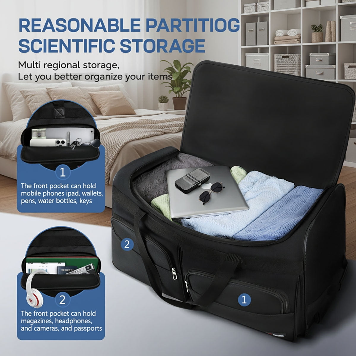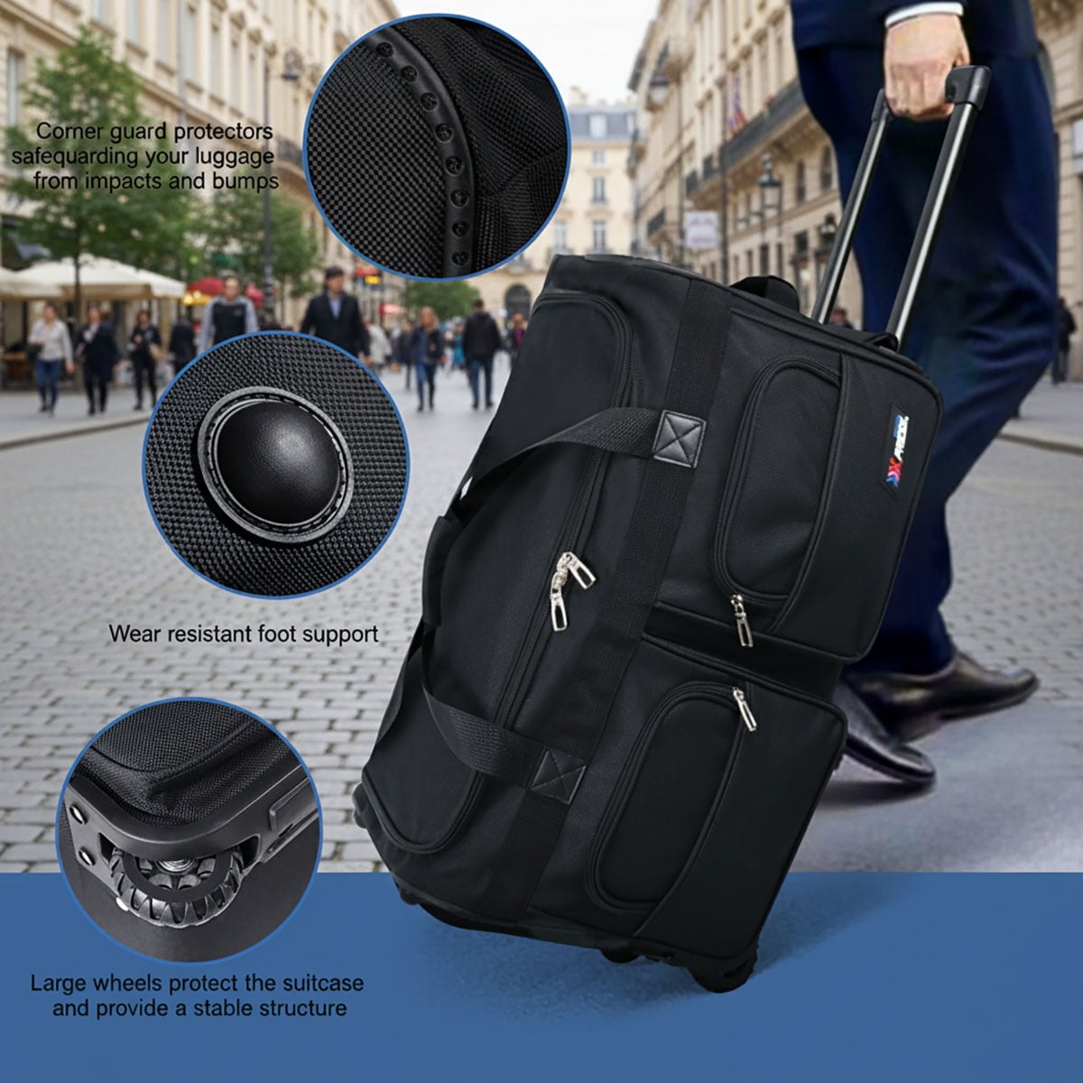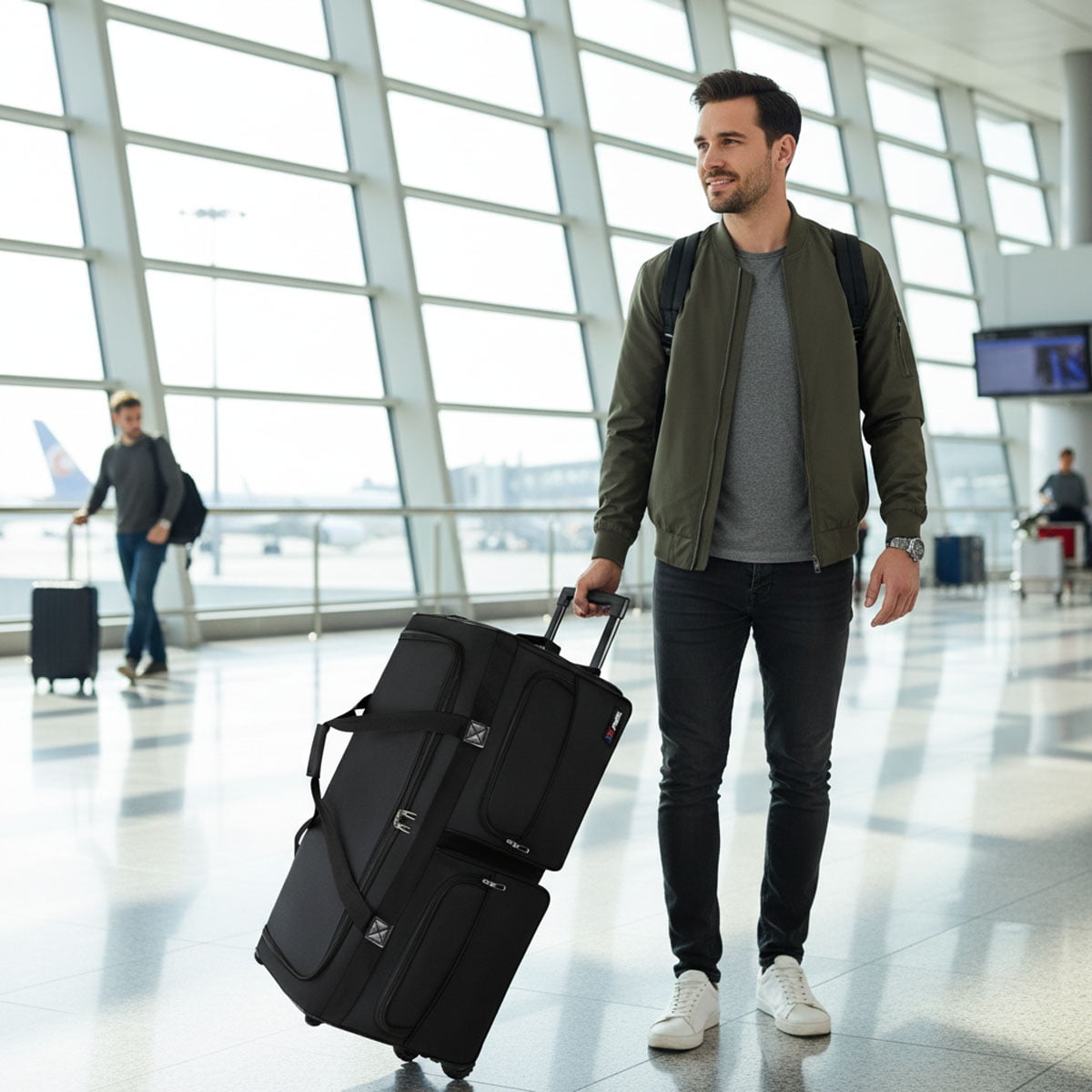 MATERIAL–Rolling duffle bag with wheels made of 600D polyester material, featuring excellent waterproof, wear-resistant, and tear-resistant properties. This durable material ensures that your bag withstands daily use and harsh conditions, keeping your belongings safe and dry. LARGE CAPACITY–1* Large U-shape zip-end opening ,2* front external zipper pockets for quick access and organization of essential items. This practical design ensures ample storage space and efficient organization for all your needs. DURABLE WHEELS & MULTIPLE HANDLE—This wheeled duffel bag features two smooth, durable wheels for easy maneuvering through airports or city streets. It also includes grab handles on the top and sides, along with a hidden retractable handle that can be adjusted for security checks, ensuring easy handling and convenience while traveling. FOLDABLE DESIGN—The duffel bag with wheelsis designed for easy portability and is collapsible for convenient storage. VERSATILE USE—Large-capacity 36″rolling duffel bag is not only a great choice for anything from business trips to weekend getaways, but also as an fitness bag, sports bag, camping bag and even storage bag to meet a variety of travel and activity needs.